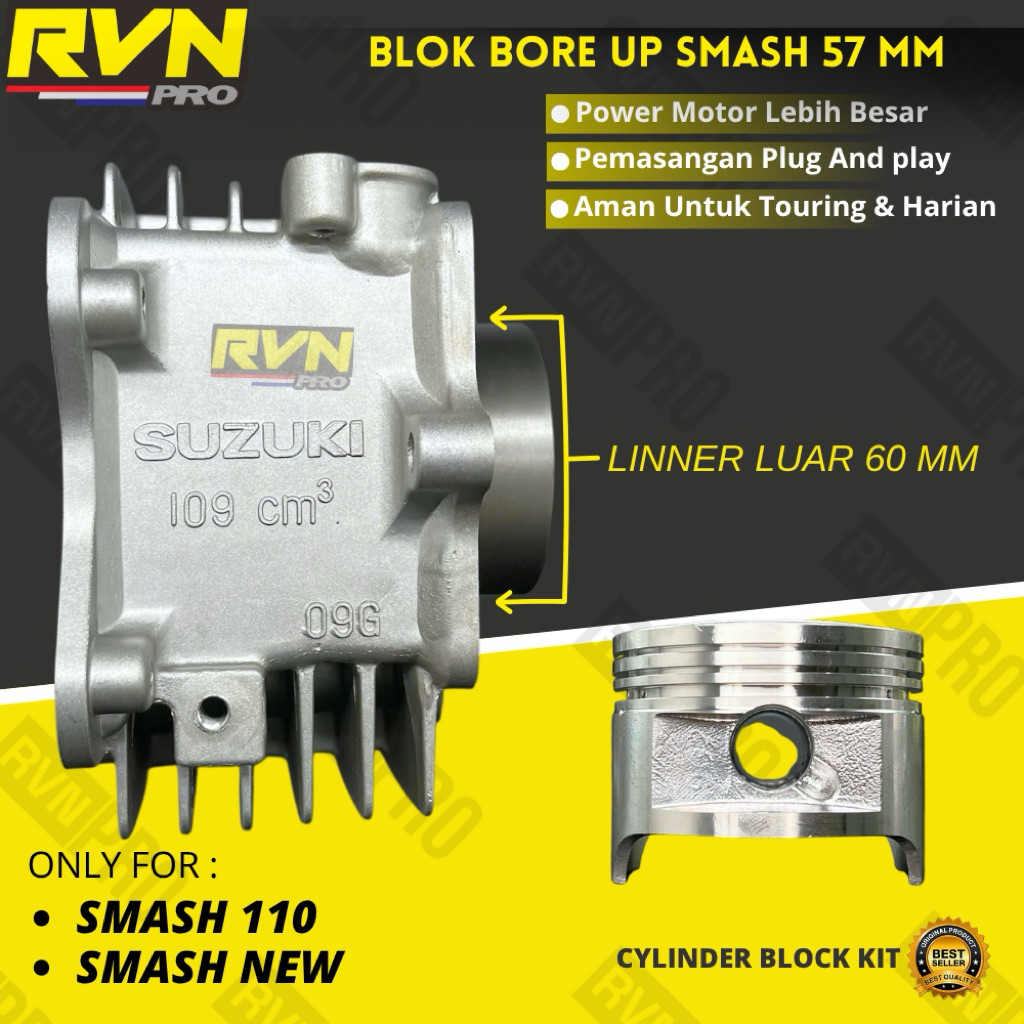 BLOCK SEHER BORING BLOK SEHER BELOK SEHER BORE UP SUZUKI SMASH 110 SMASH NEW 57 MM 57MM ORIGINAL RVN PLUS PISTON KIT RING SEHER BONUS PAKING RVN RACING