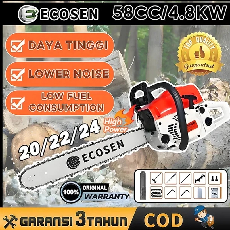 ECOSEN Gergaji Mesin Chainsaw 58CC 2Tak 20/22/24inch Gergaji Potong Pohon Kayu Gergaji Mesin Potong