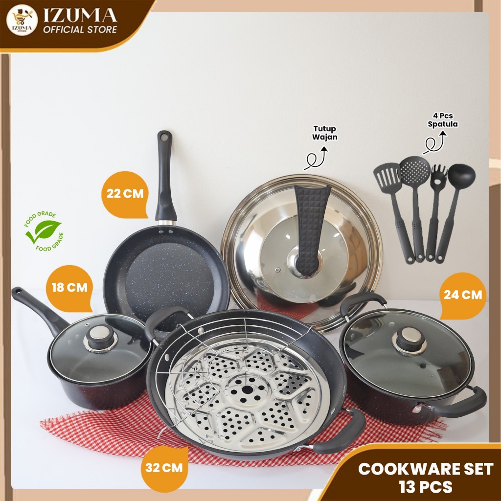 IZUMA Panci Set Isi 13pcs Pot Series/ Panci Terlengkap dengan Tutup kaca Dan Stainles Tutu Free Spatula