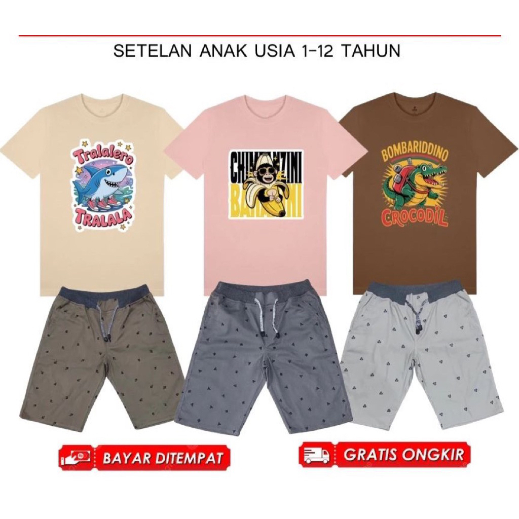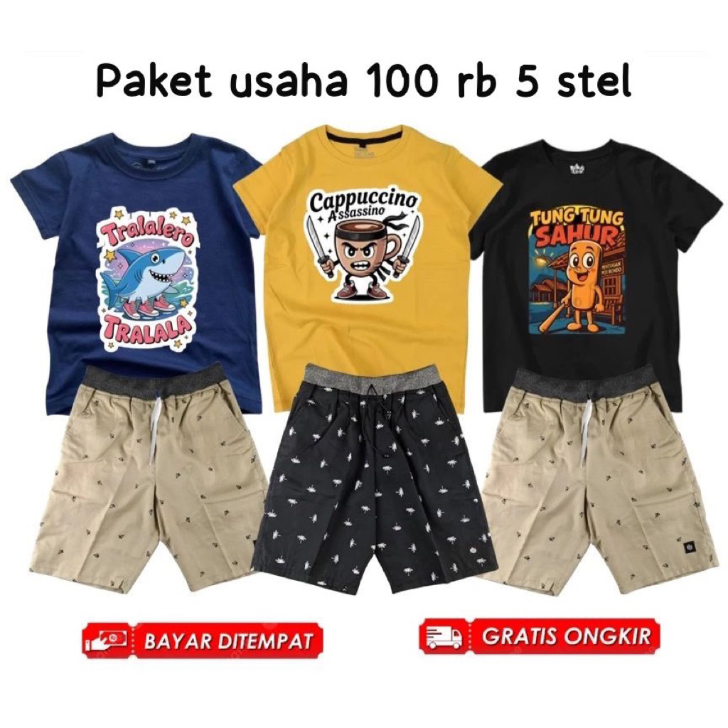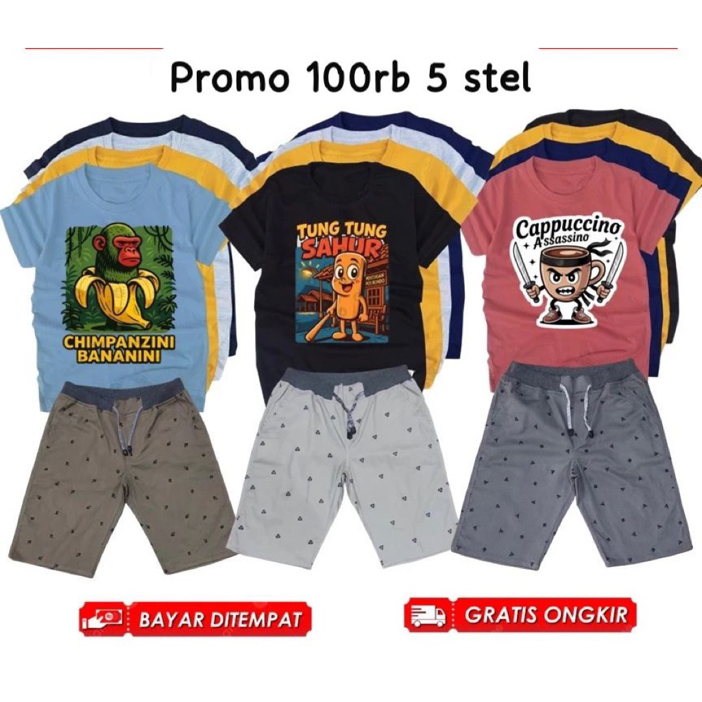 [PAKET USAHA] Promo 100rb Dapat 5 Stelan Anak Anomali tung tung sahur Dapat 5 Kaos 2 Celana Pendek Motif