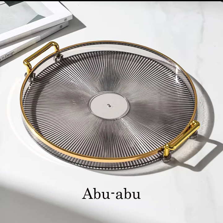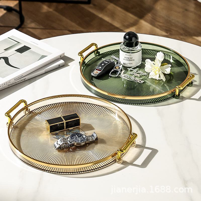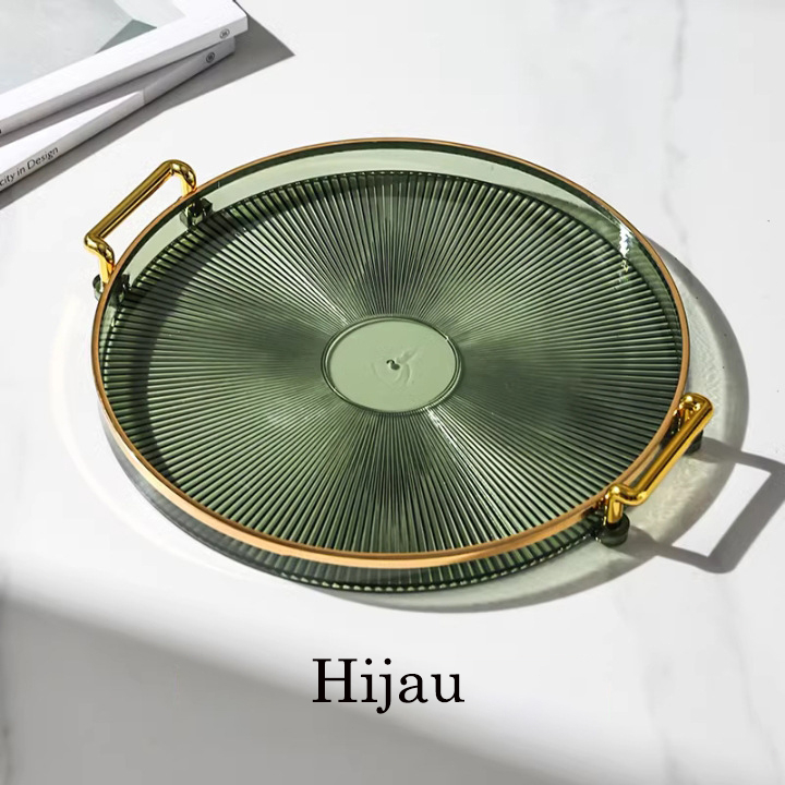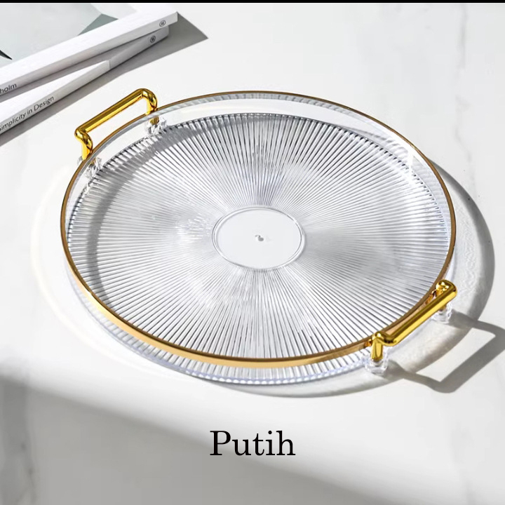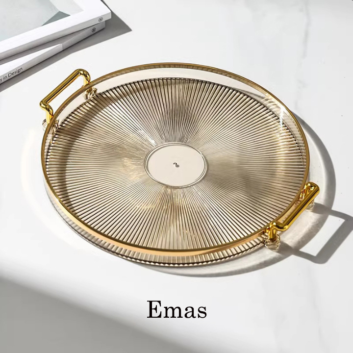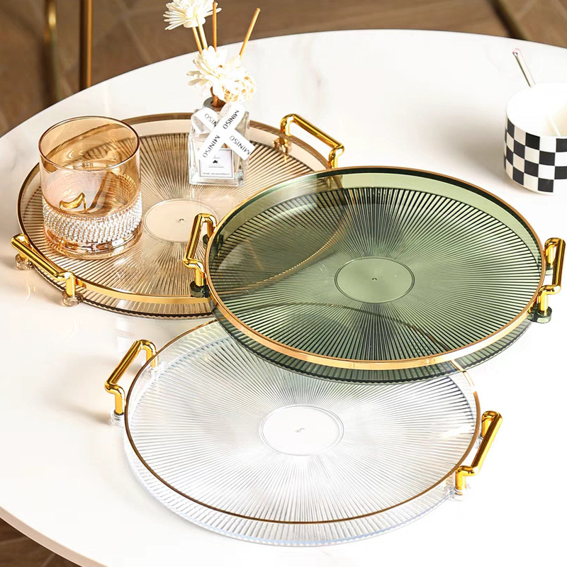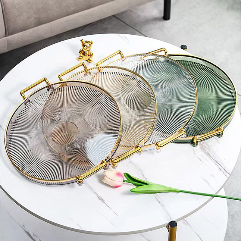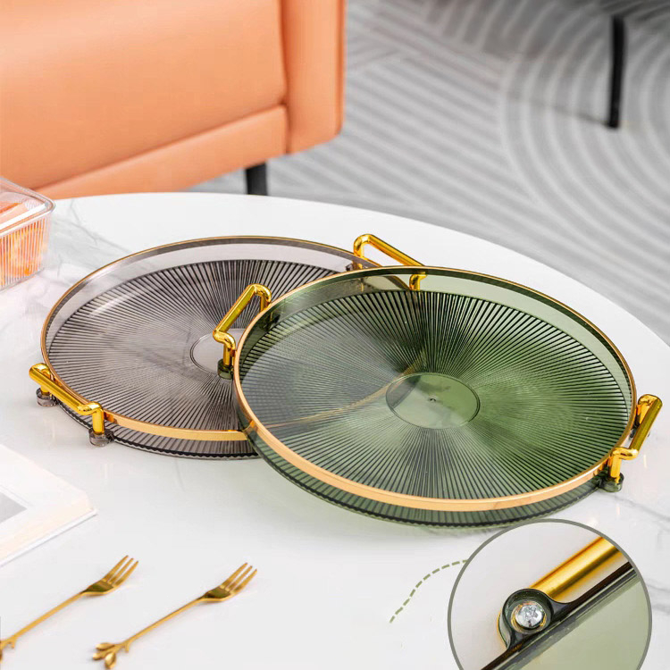 Dekorasi Nampan Tray Mewah Plastik Bulat Baki Transparan Makanan Ringan Buah Wadah Perhiasan Multifungsi Emas Mewah Baki Penyimpanan Permen Baki Deluxe Berbingkai Emas Bulat