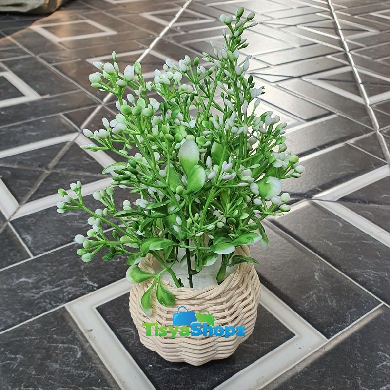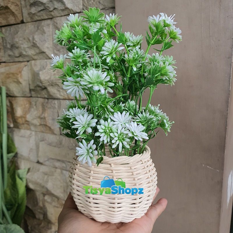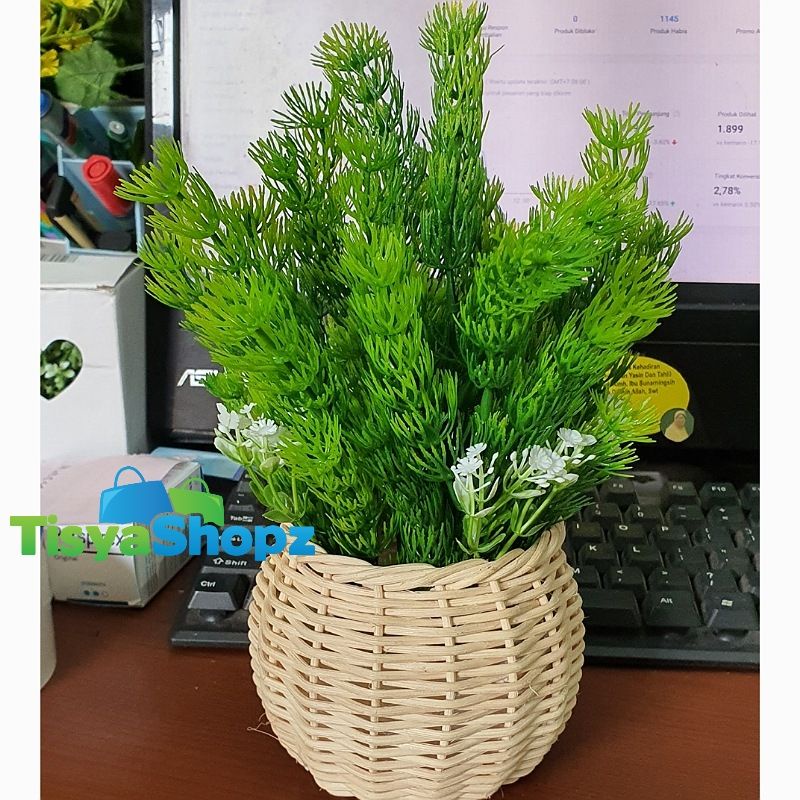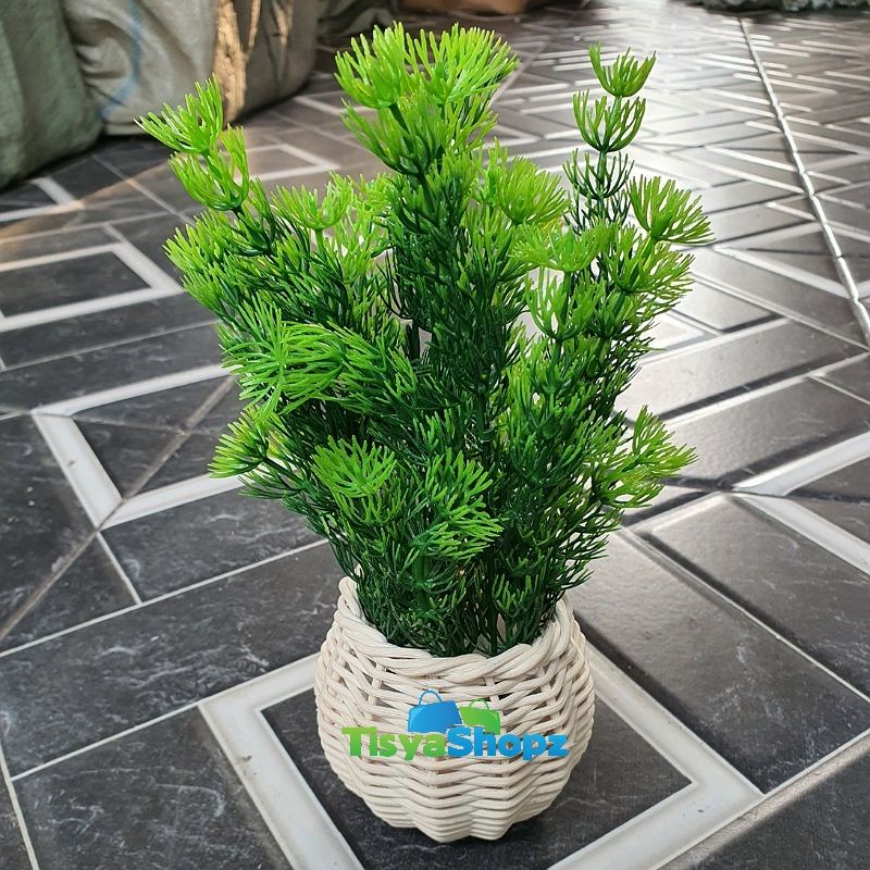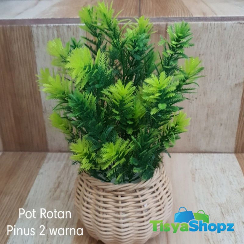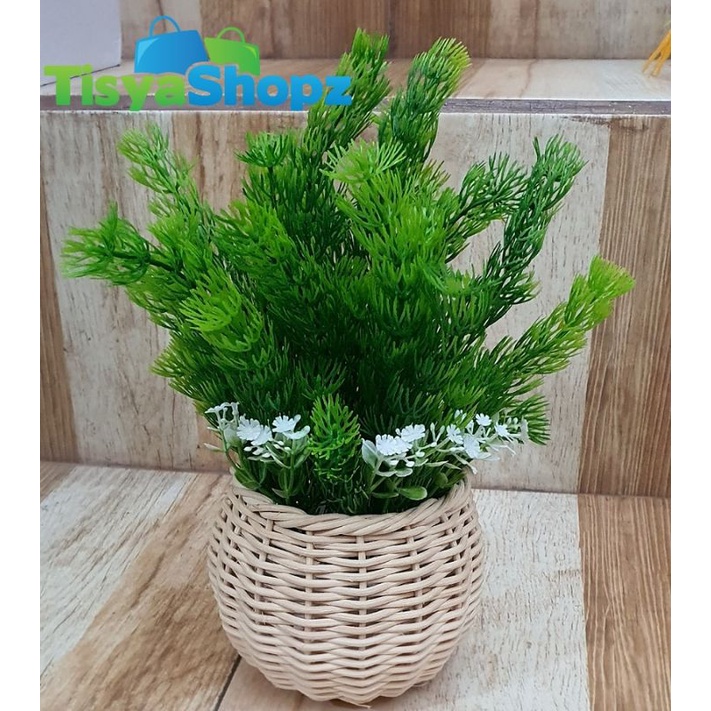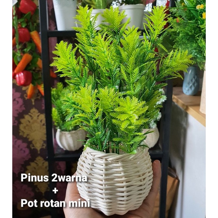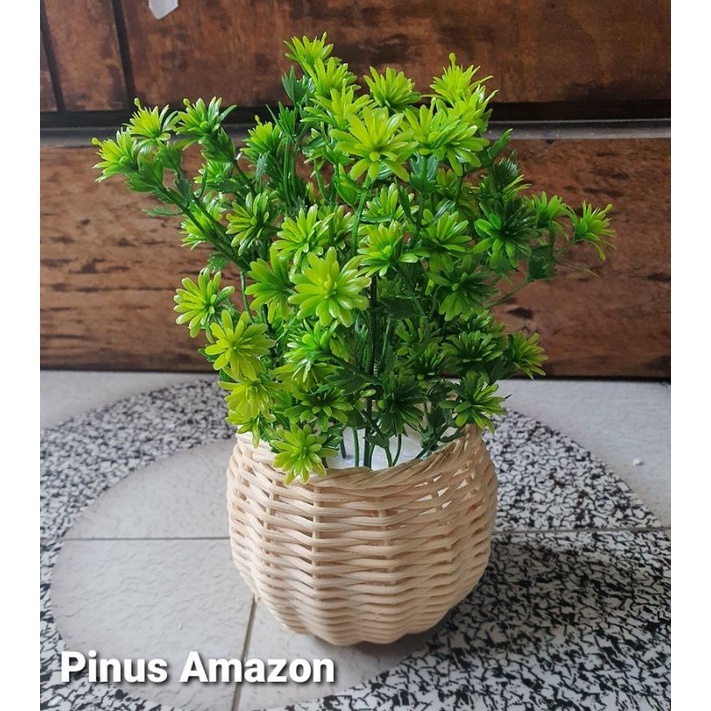 Bunga Pinus Hijau + Pot Rotan Set