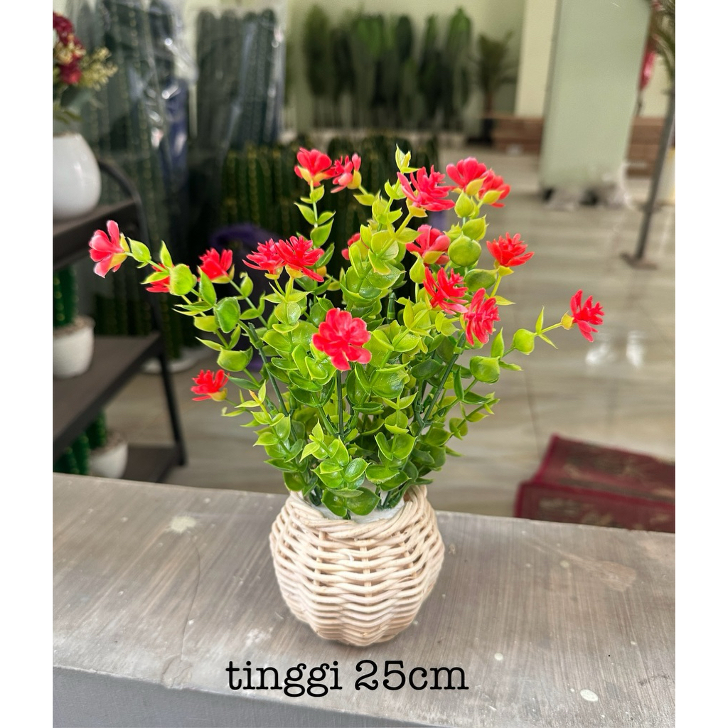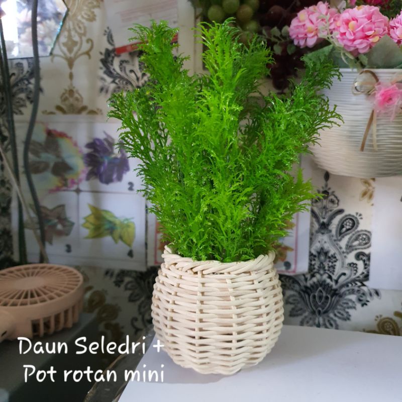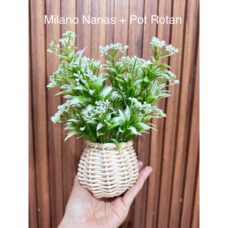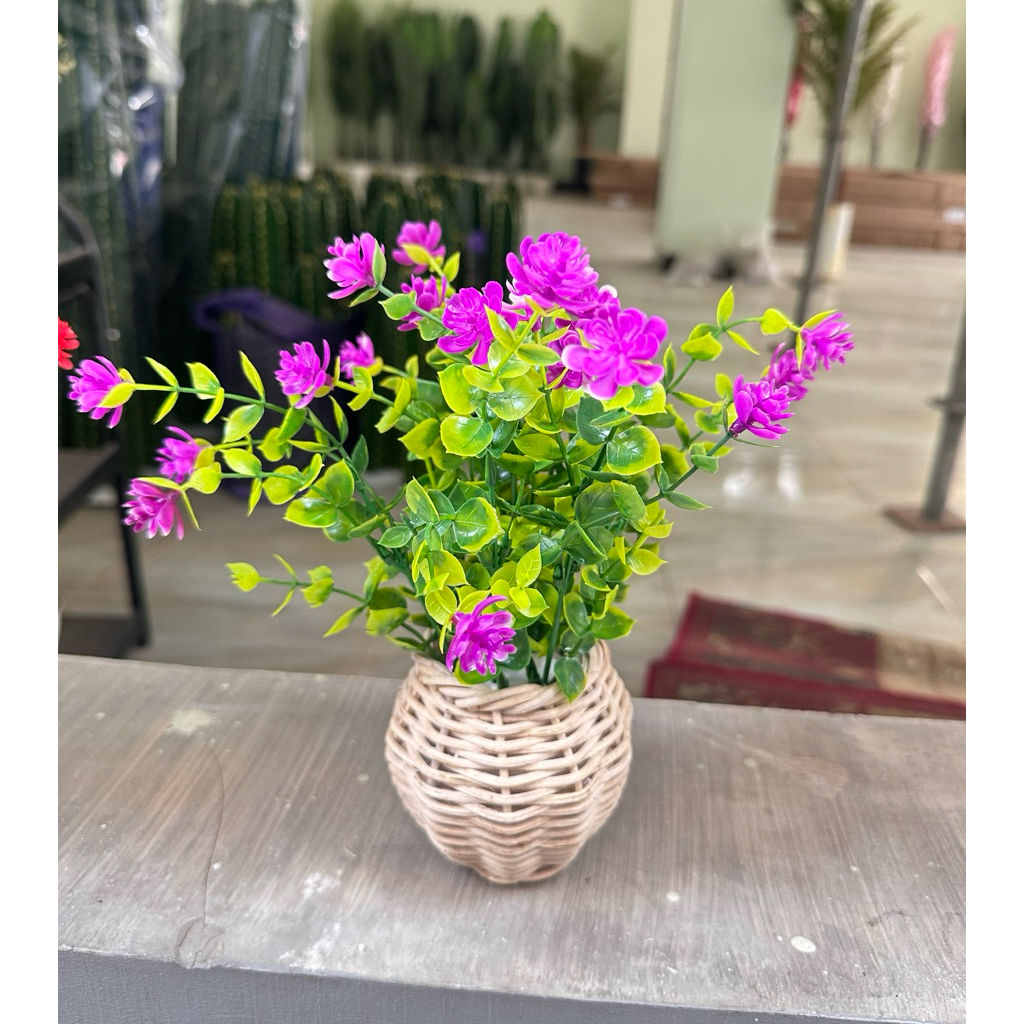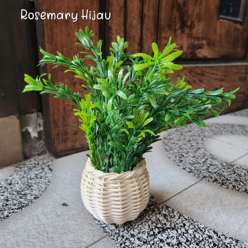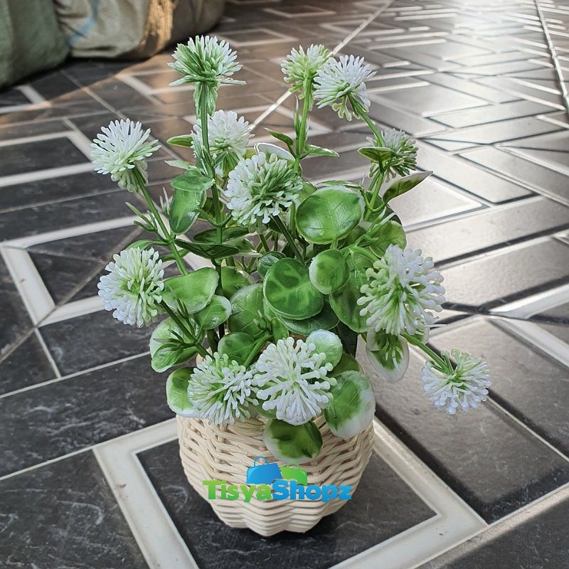 Bunga Pinus Hijau + Pot Rotan Set