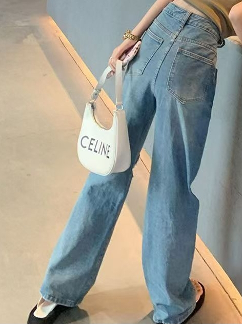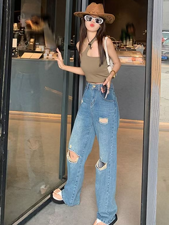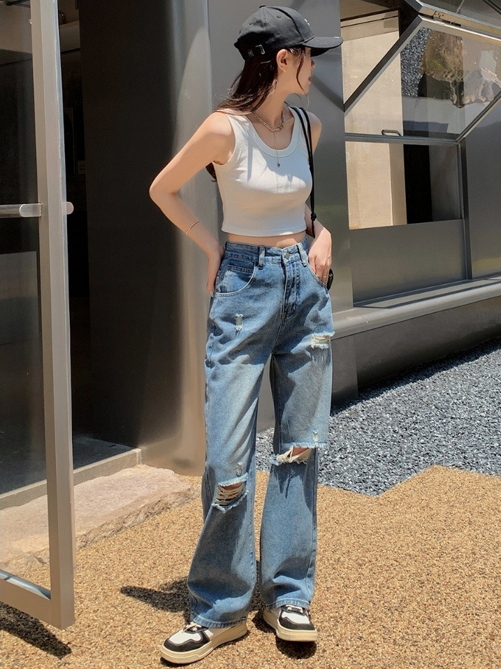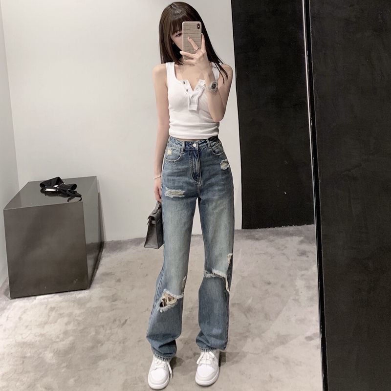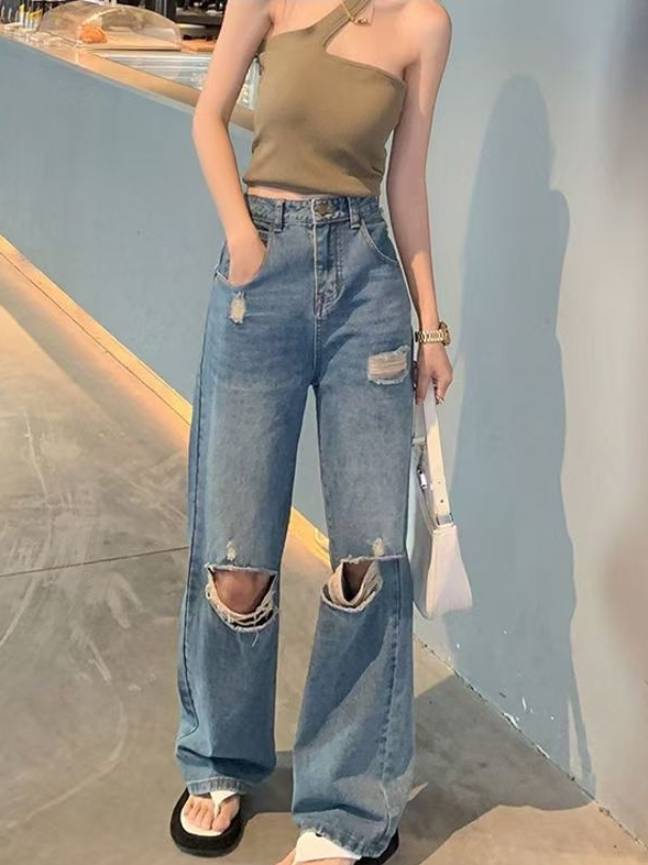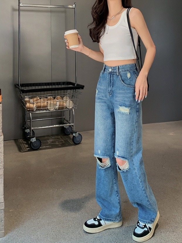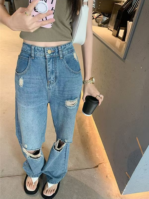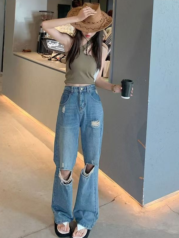 [Sari]Celana jeans wanita model retro baru, high waist, robek, dan lebar 020