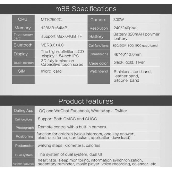 M88 Smart Watch Phone Bluetooth 4.0 Heart Rate Monitor for Android IOS