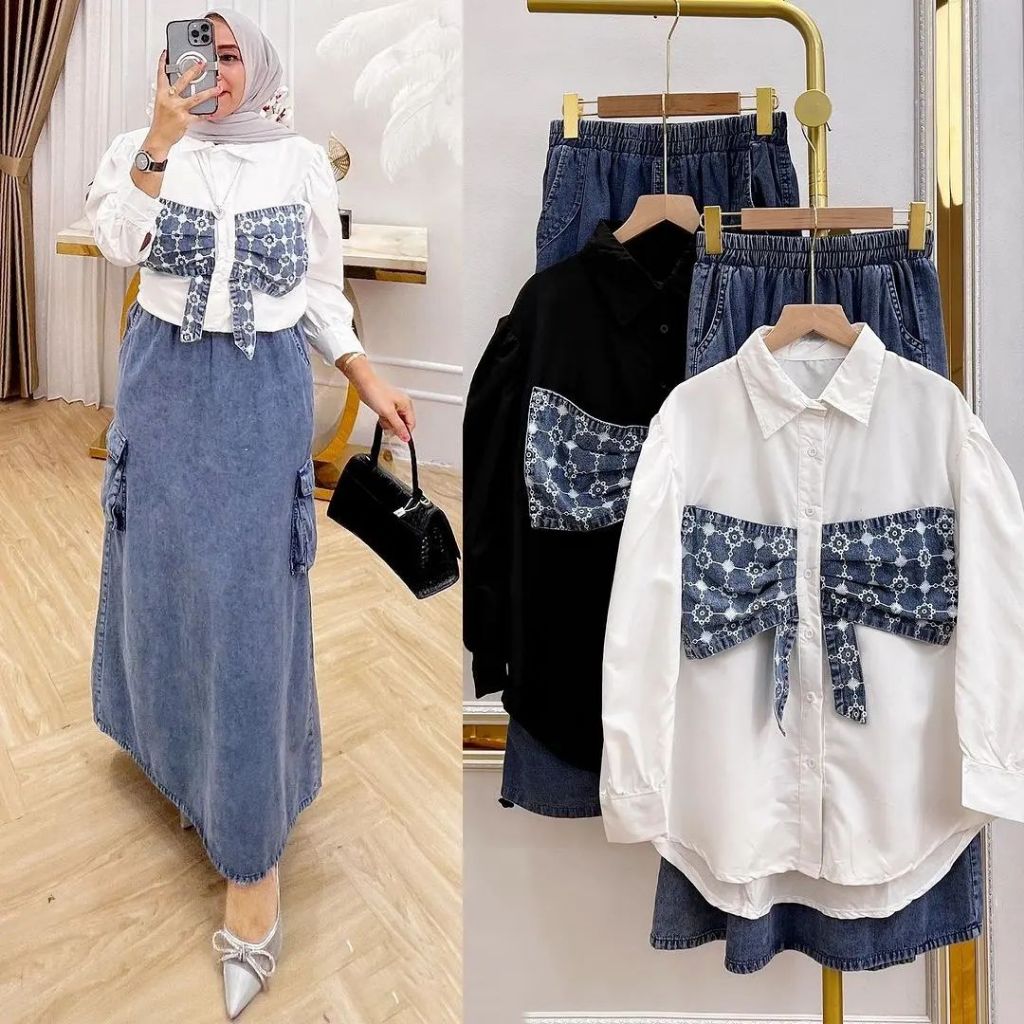 [COD] - Baju setelan wanita Dewasa Terbaru - Baju kemeja dan rok denim wanita - Setelan jeans wanita trandy - Kemeja wanita toyobo premium - Rok denim wanita - setelan jeans wanita dewasa