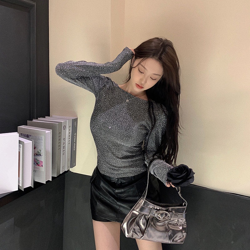 Heavy Industry Hot Diamond Bottom Round Neck Loose Long sleeved Top Women's Small Shirt T-shirt