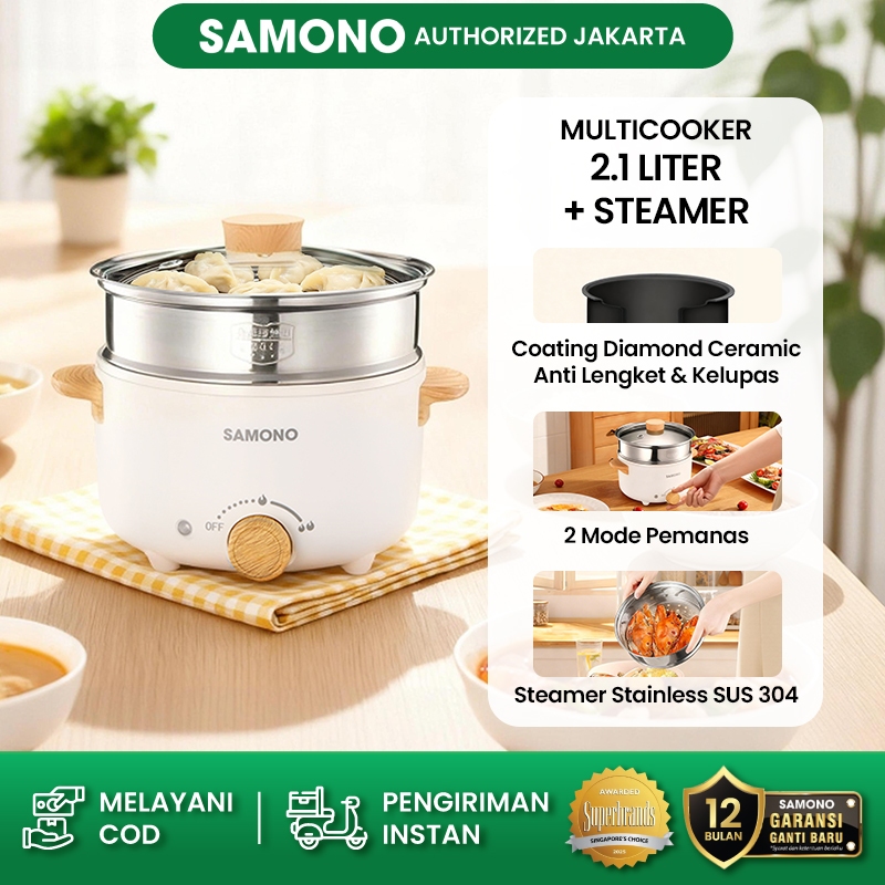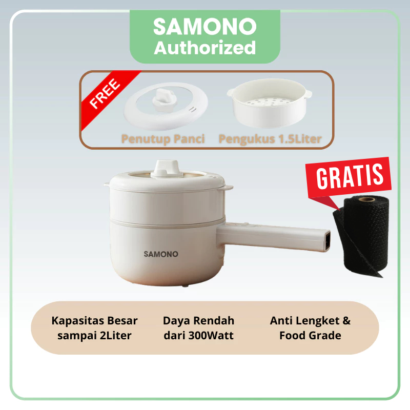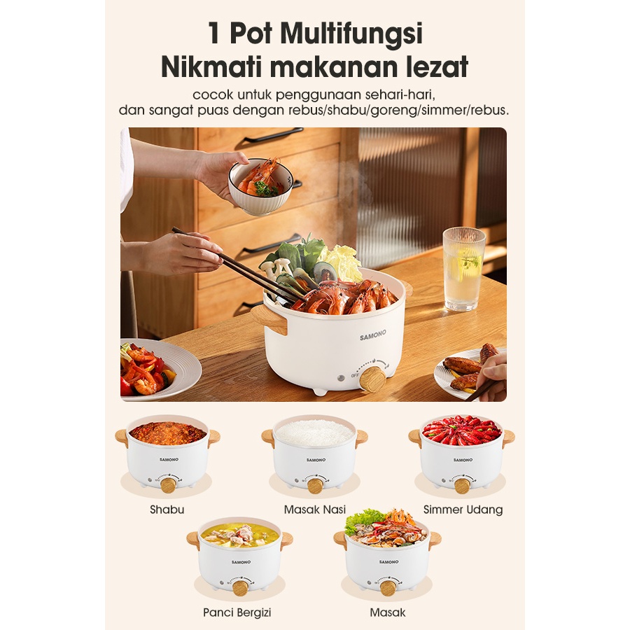 SAMONO Panci Listrik Multifungsi 2.4 Liter Kukusan 1.6 Liter 2 Mode Panas Panci Kukus Panci Kos Low Watt Fry Pan Teflon Keramik Kukusan Stainless Serbaguna Low Watt Garansi 1 Tahun - SW-DG01S