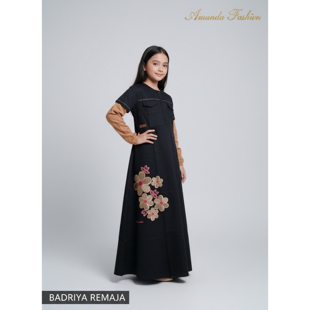Gamis Amanda Badriya Remaja Bahan Soft Jeans Mix Rayon Twill Premium Bordir Bunga (Free Pouch Goodie Bag)