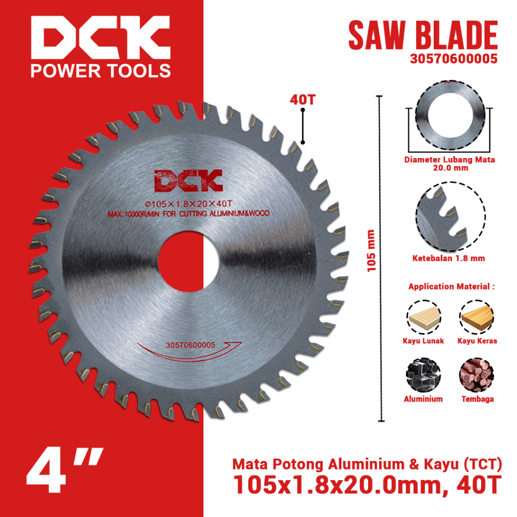 DCK Saw Blade (TCT) 4 Inci / Mata Potong Aluminum & Kayu 105×1.8×20.0mm, 40T