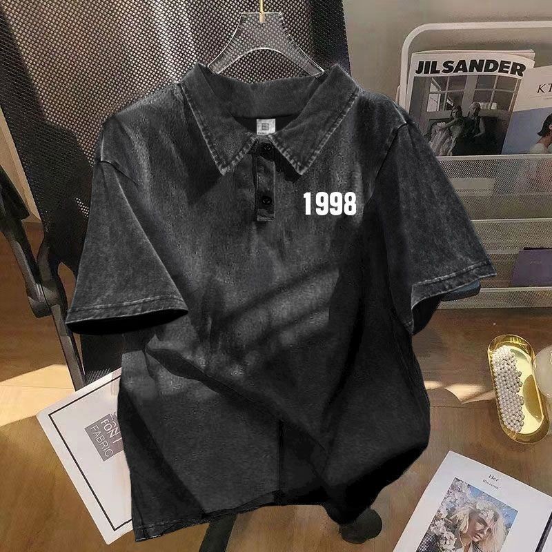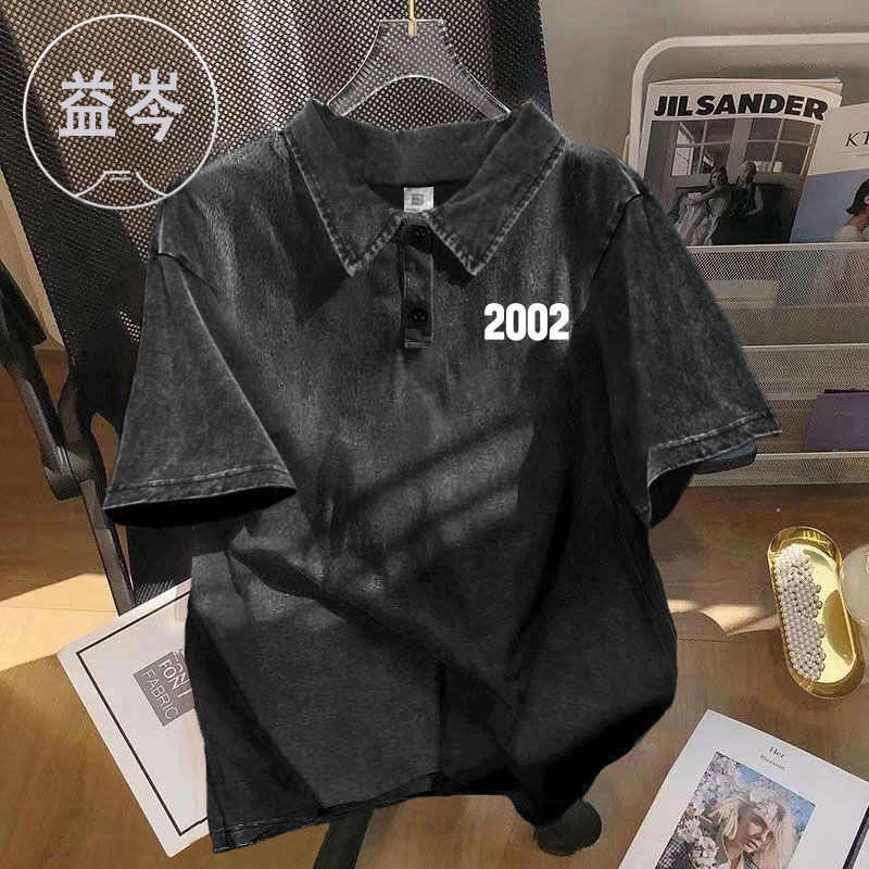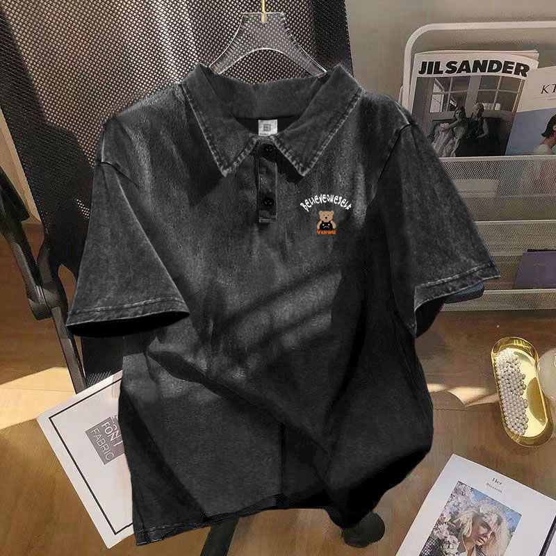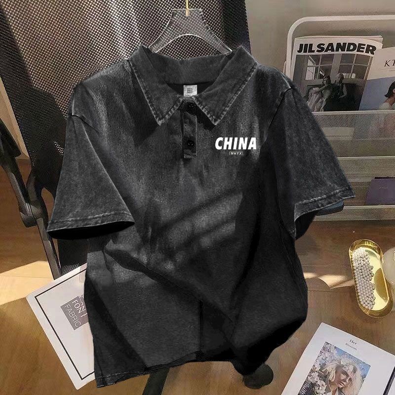Heavyweight washed Polo shirt for men's trendy loose fitting Hong Kong style lapel distressed short sleeved T-shirt summer ins oversized top
