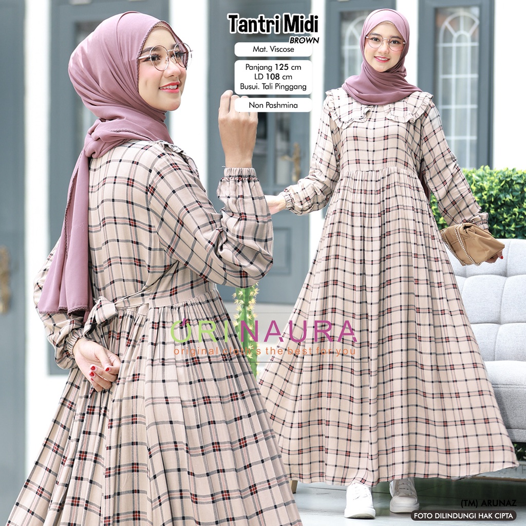 Tantri Midi Dres Kotak-kotak Wanita LD 108 cm Tali Pinggang Gamis Busui Friendly Nyaman Baju Muslim Rayon Viscose Adem