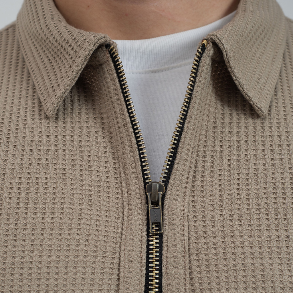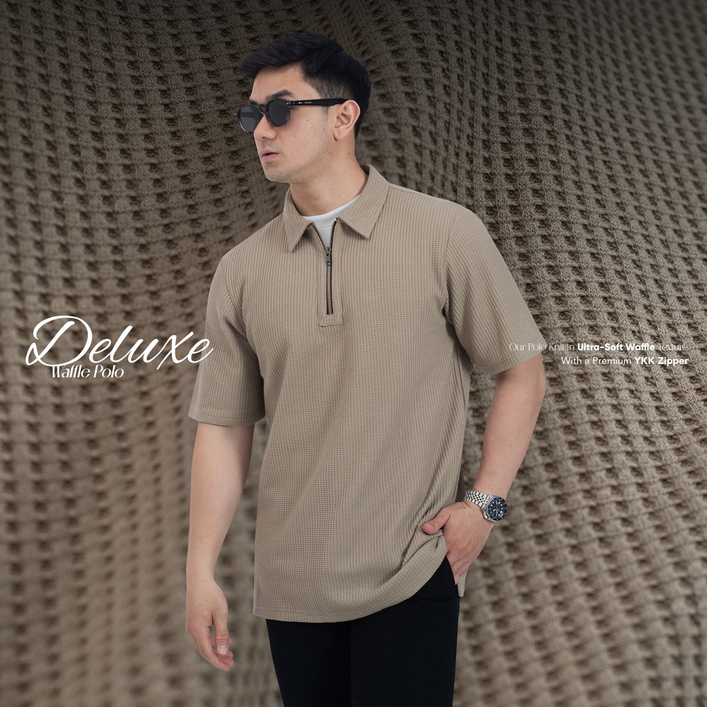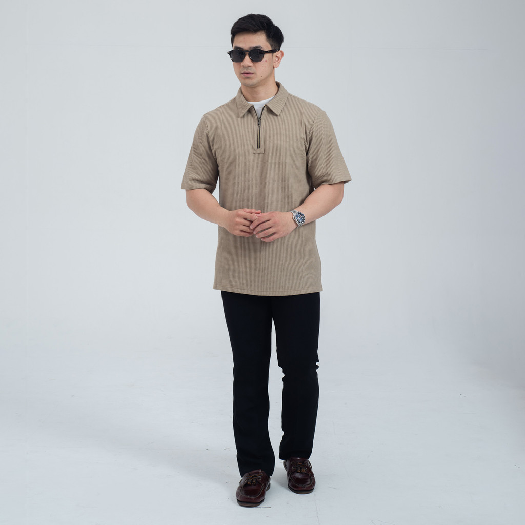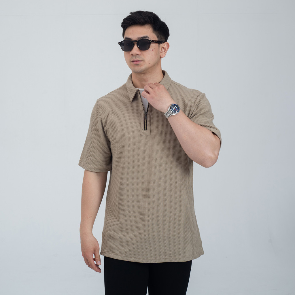 Deluxe Waffle Polo Zipper WOODCUTTER Kaos Polo Pria Basic Shortsleeve - Cream Choco Lengan Pendek