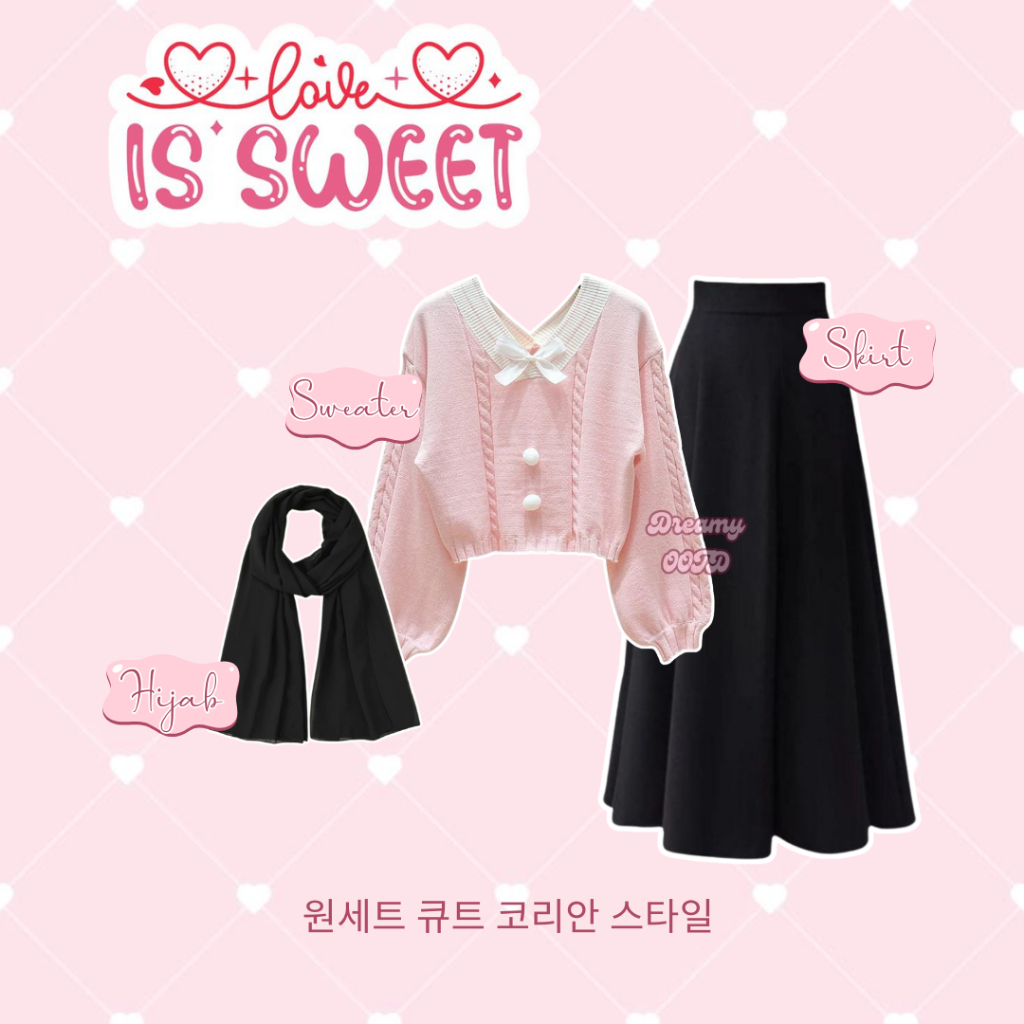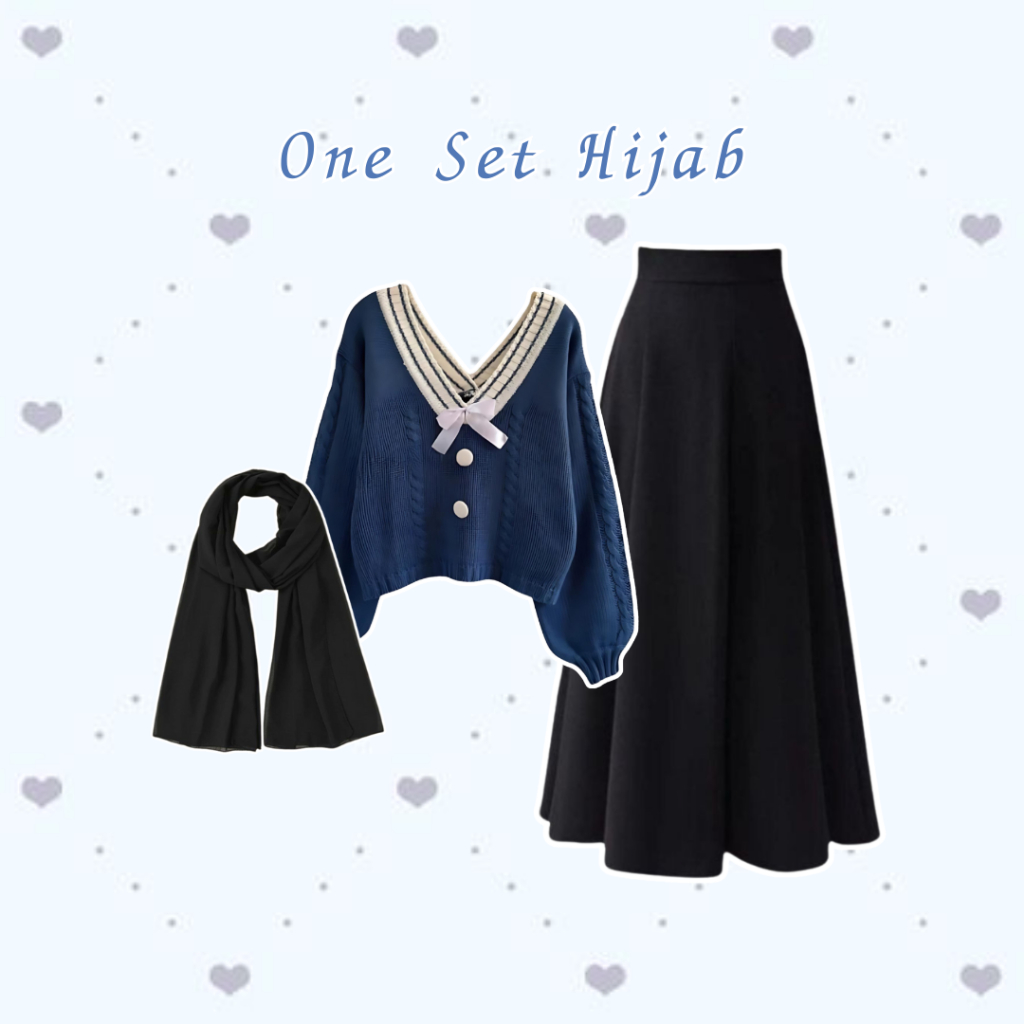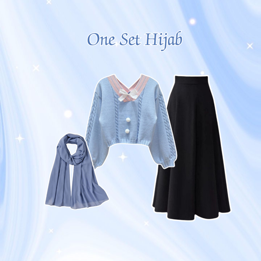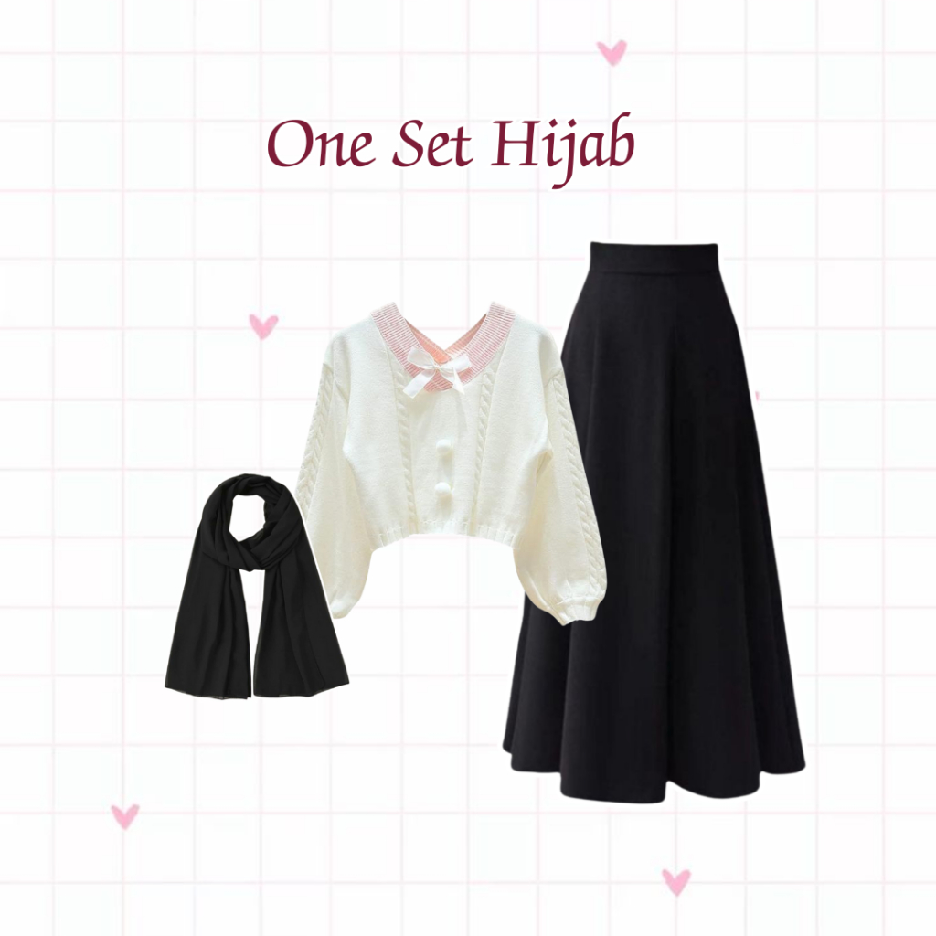 Dreamy OOTD - 3 In 1 Set Hijab Style Outfit Korea One Set Wanita Kekinian OOTD Korean Buat Daily Study Tour Sweater HIjab Skirt Set AD420
