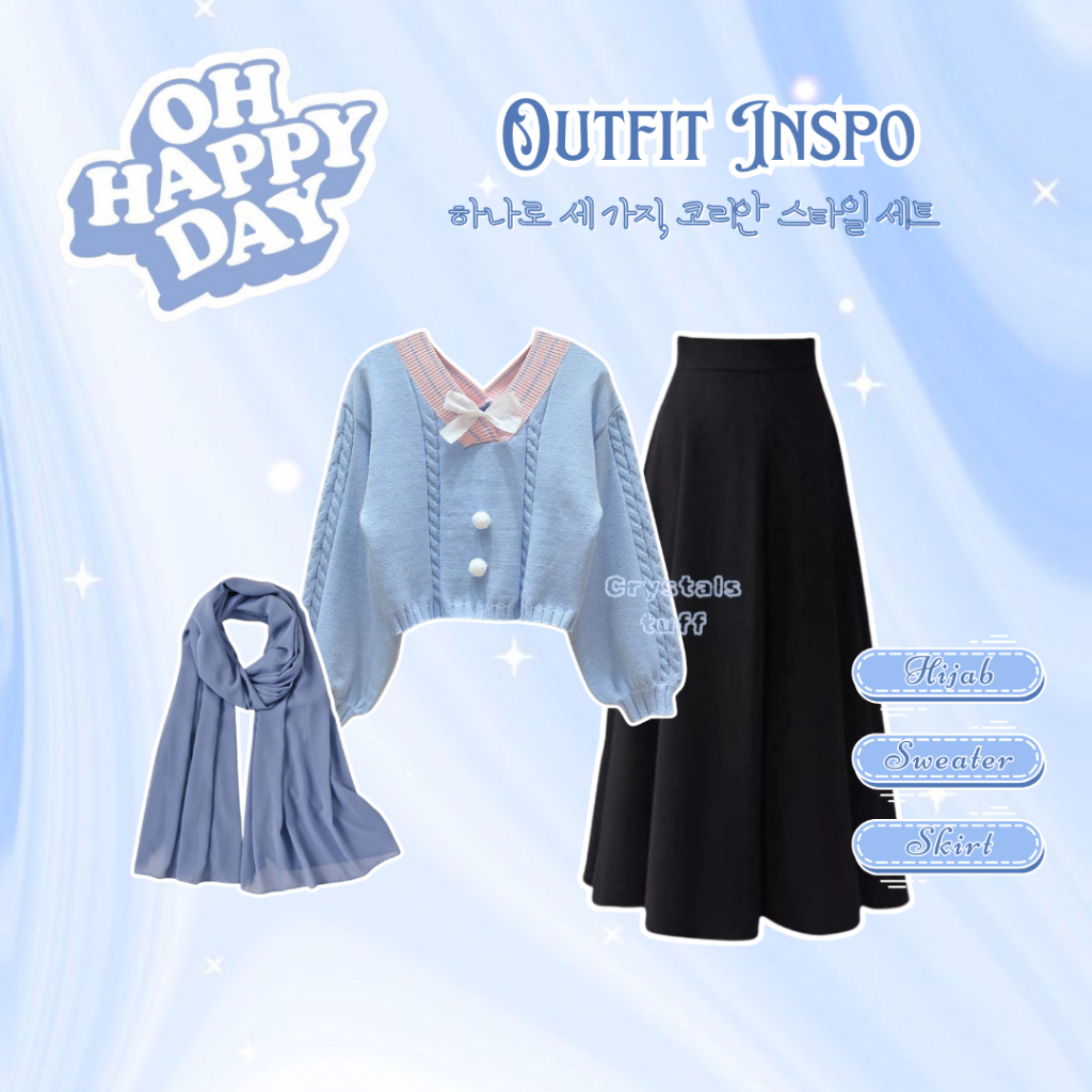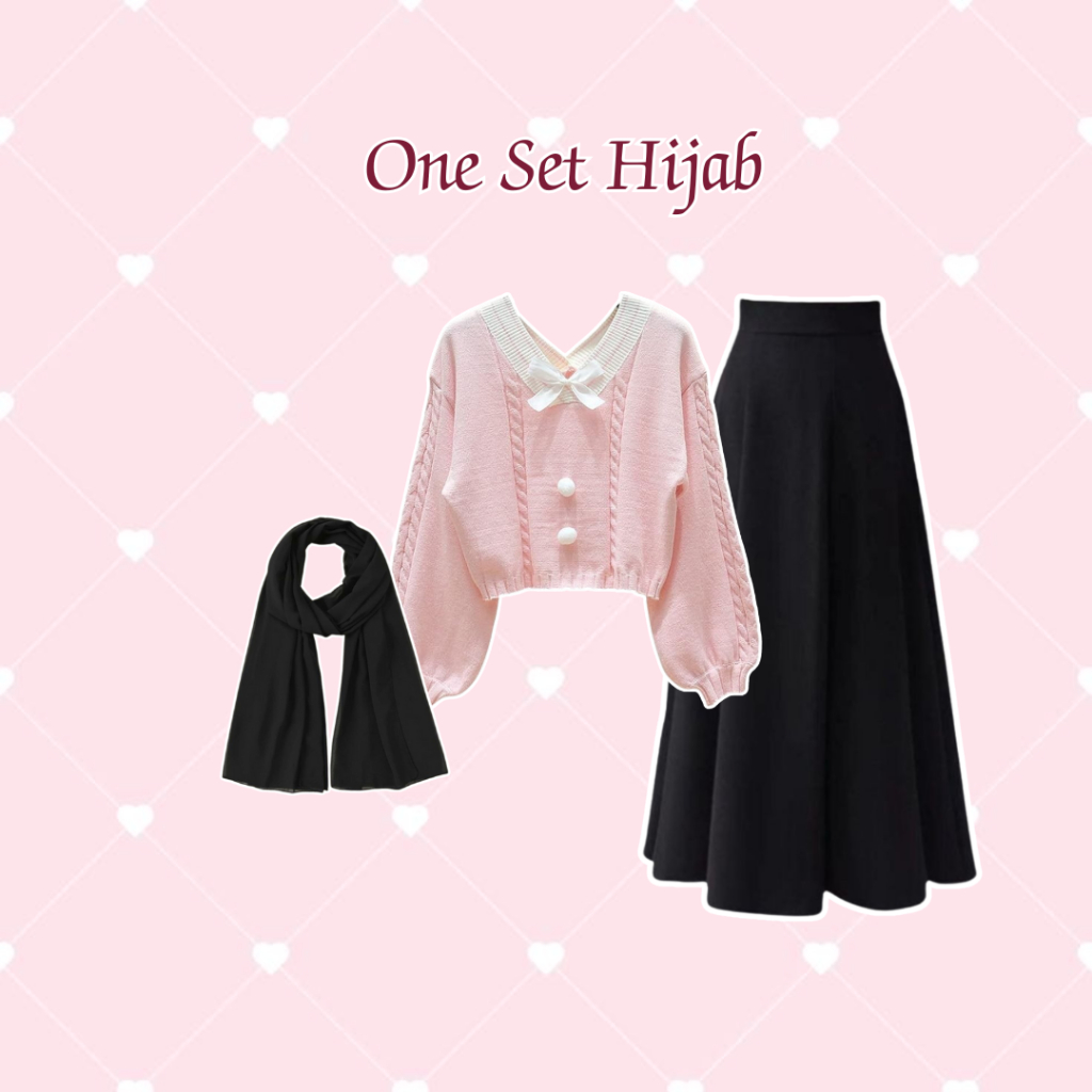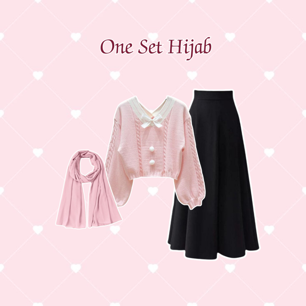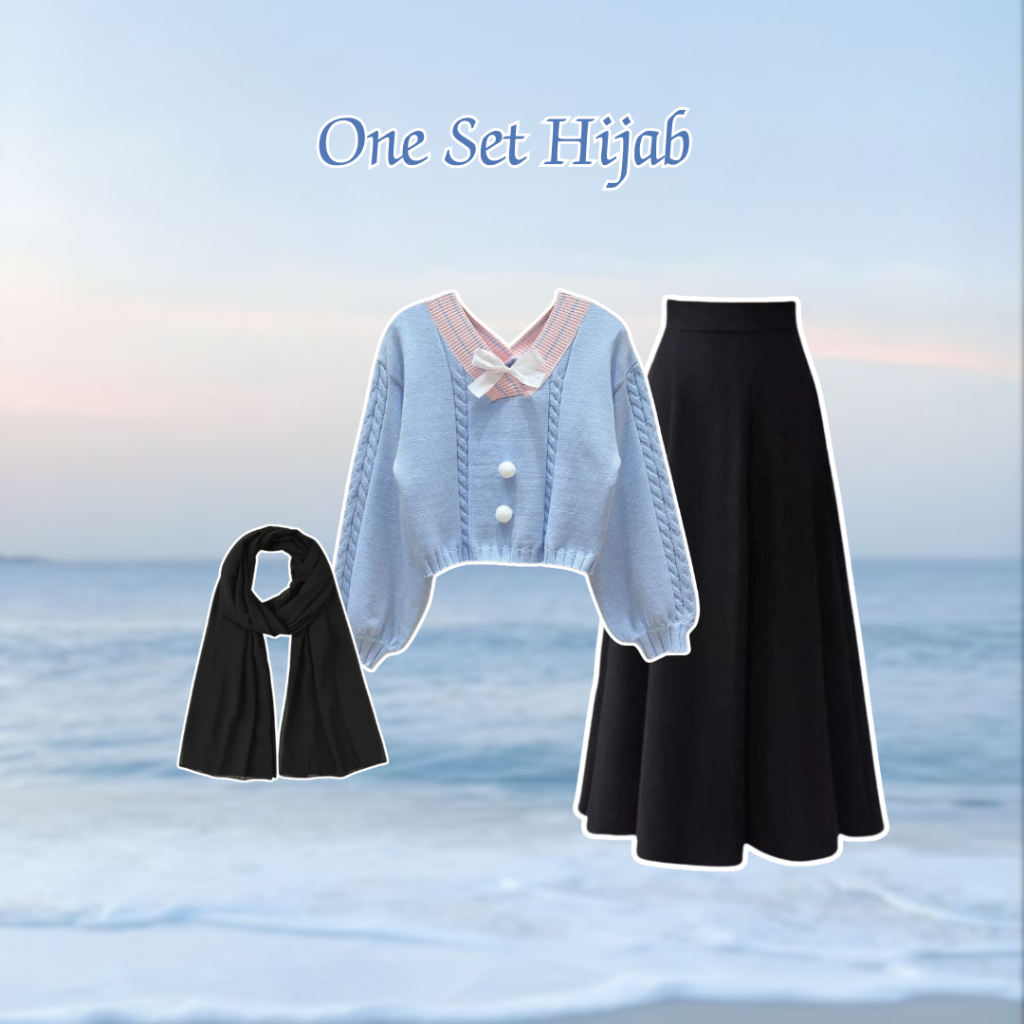 Dreamy OOTD - 3 In 1 Set Hijab Style Outfit Korea One Set Wanita Kekinian OOTD Korean Buat Daily Study Tour Sweater HIjab Skirt Set AD420