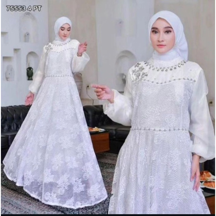 Gamis Brokat Putih Organza Mutiara Bunga Baju Muslim Jumbo Wanita 75553 4