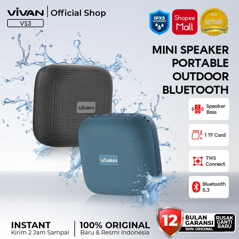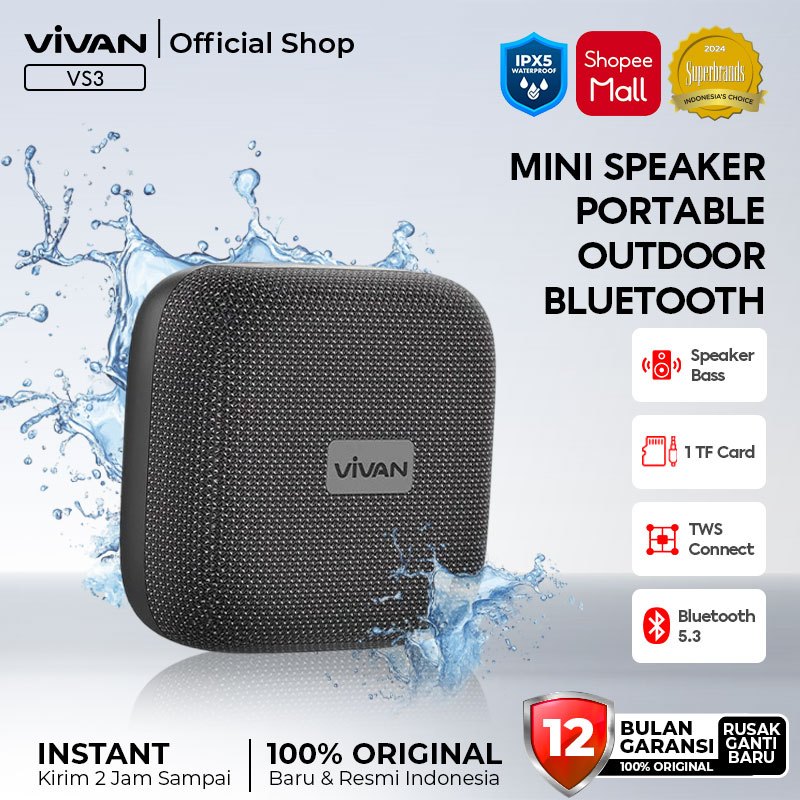 VIVAN Mini Portable Bluetooth Speaker VS3 IP67 TWS Interkoneksi Bass Up Ringkas Garansi 12 Bulan