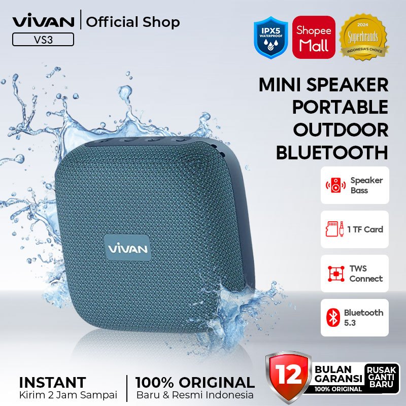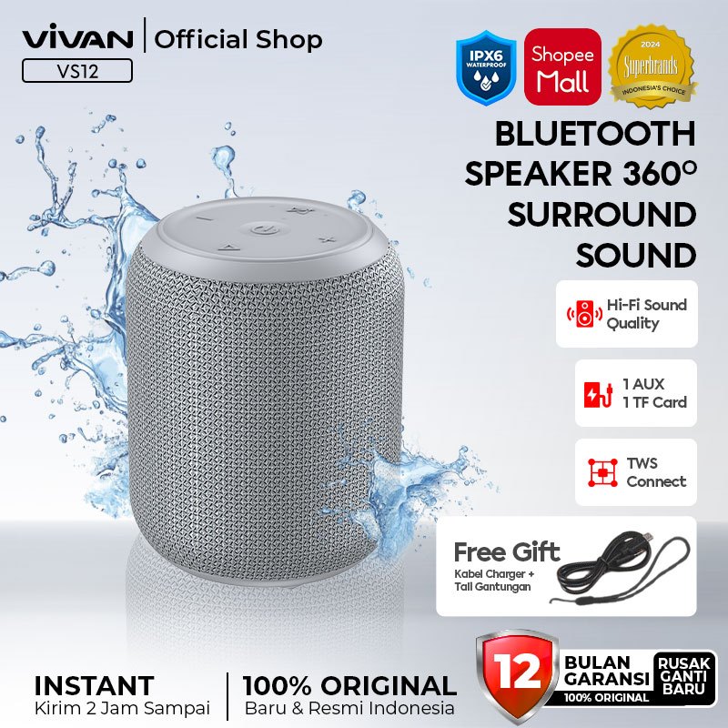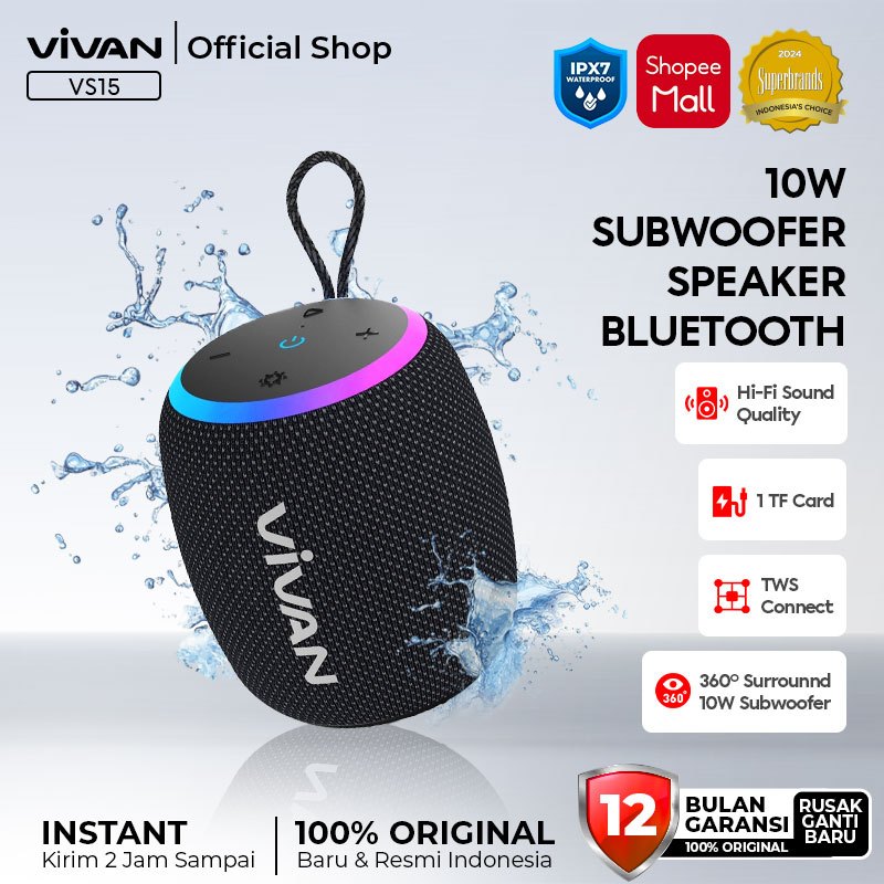 VIVAN Bluetooth Speaker VS15 Sound 360° Waterproof IPX7 Hi-Fi Super Bass RGB Light Garansi 12 Bulan