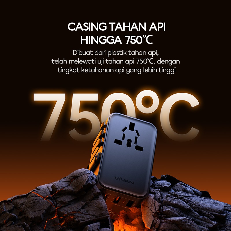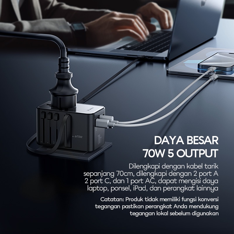 VIVAN Travel Adaptor VPS-T006A | 70W GaN 10A PD QC 3.0 | Retractable Cable Type C | 5 Output - Garansi 3 Tahun