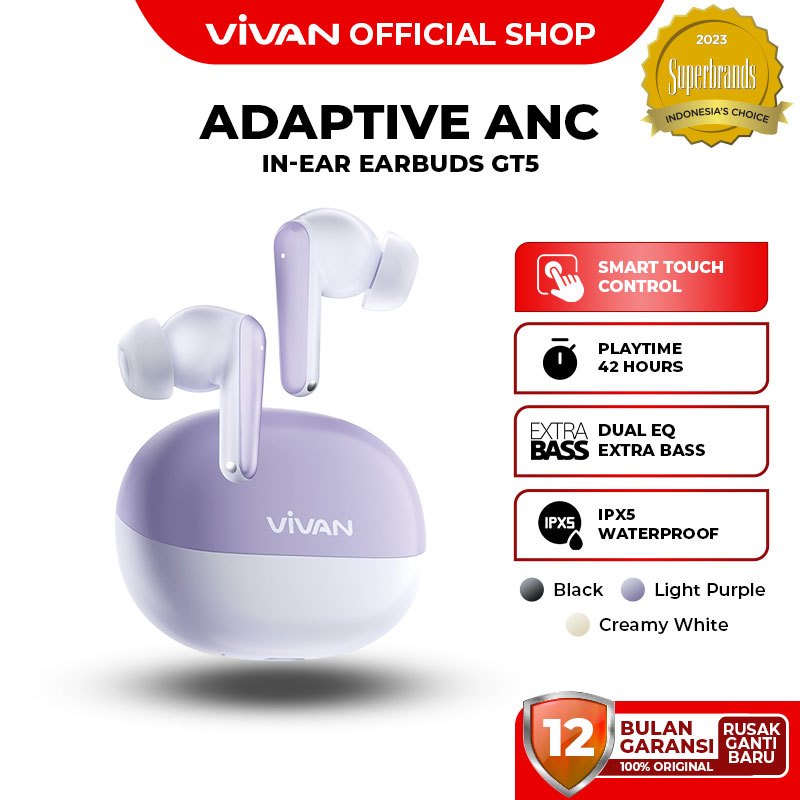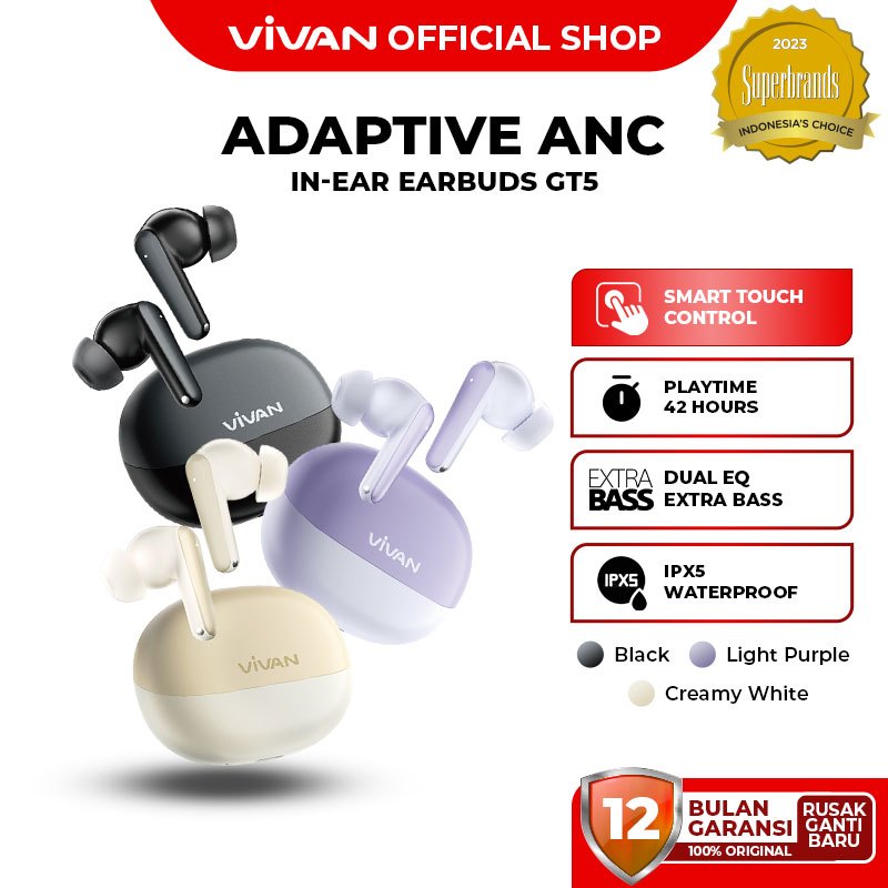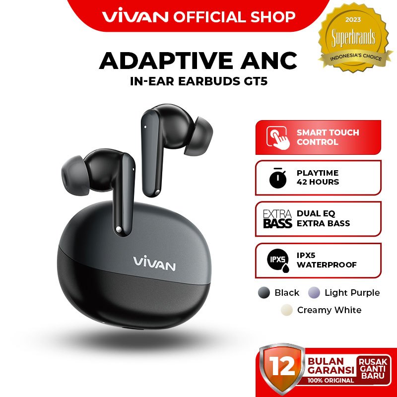 VIVAN TWS Infinity GT5 | DUAL EQ Extra Bass | Adaptive ANC Transparancy Mode | Bluetooth 5.4 | Playtime 42 Jam Headset Bluetooth Earbuds - Garansi 1 Tahun