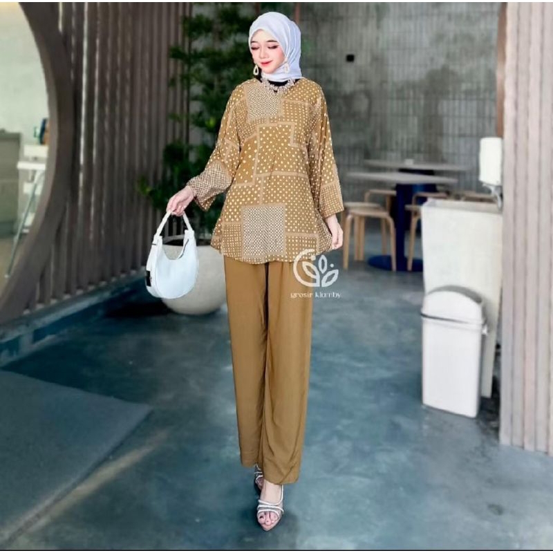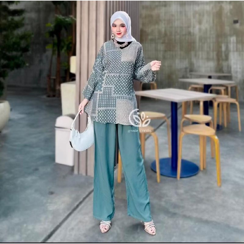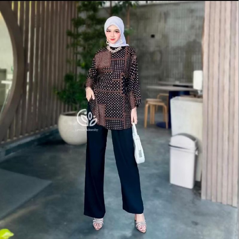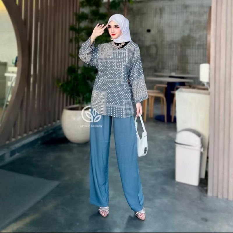 One set palisade rayon busui jumbo batik atasan celana wanita motif setelan
