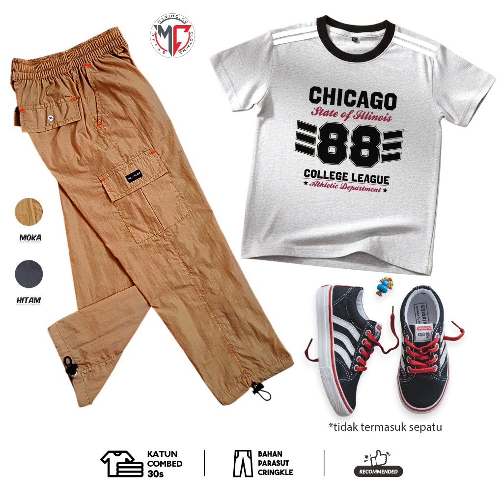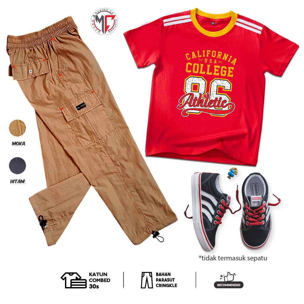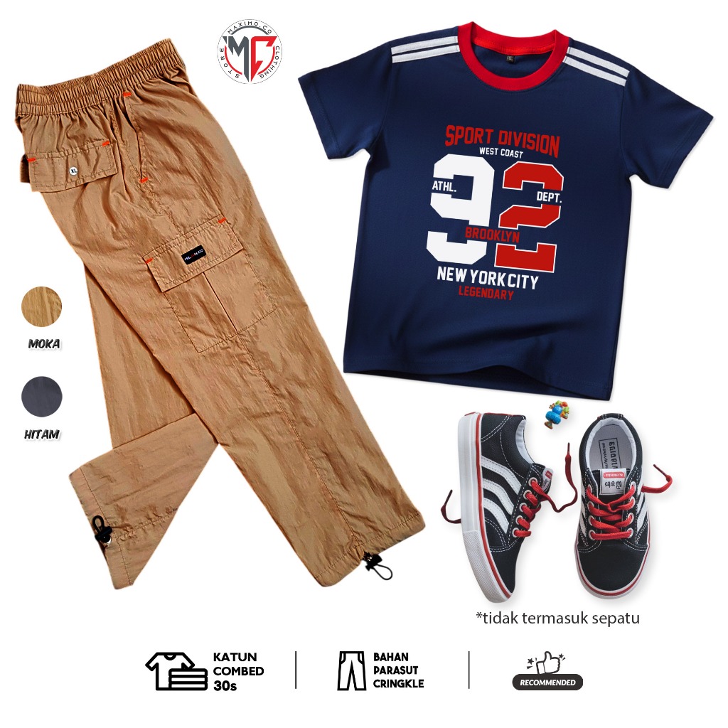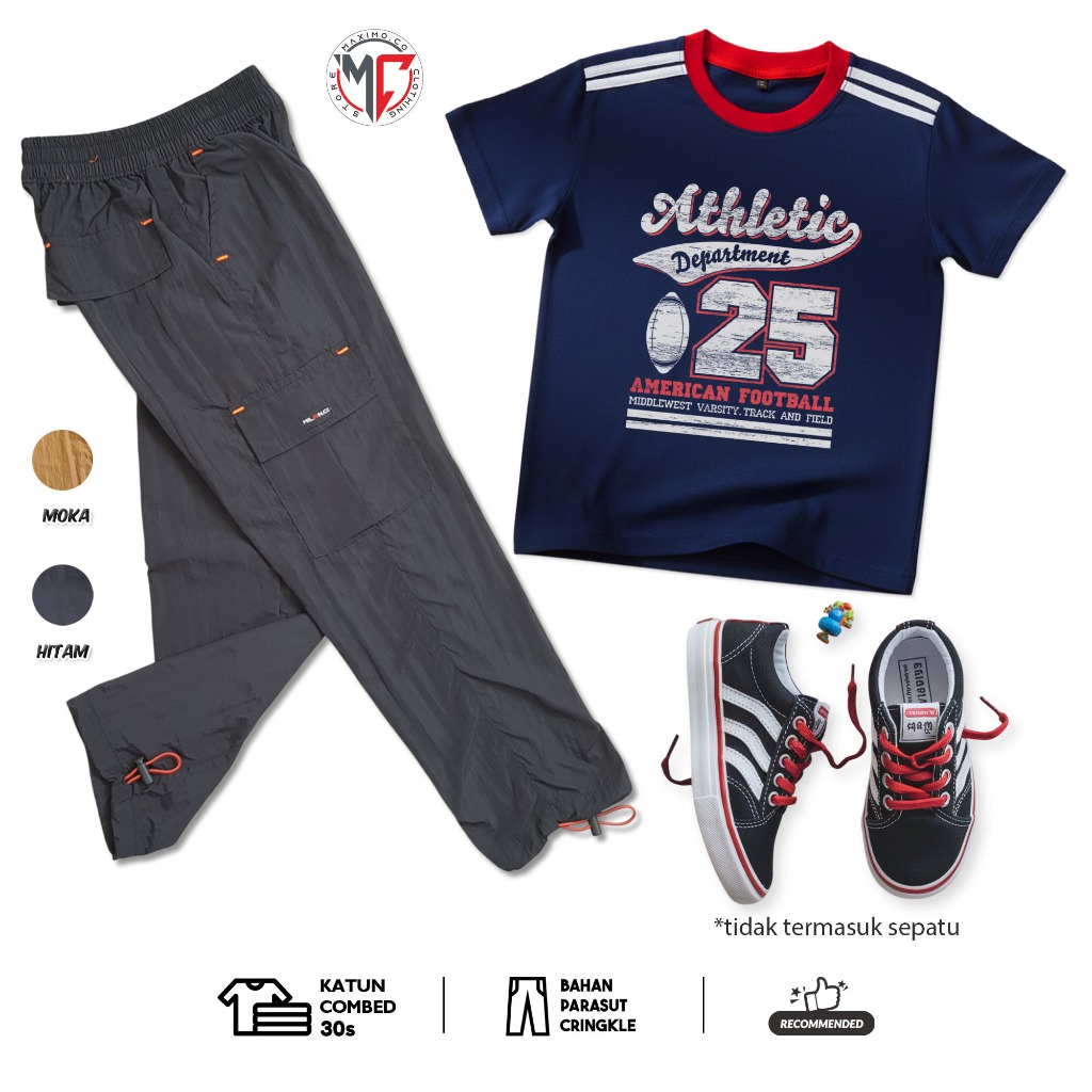 MAXIMO.CO Setelan Baju Anak Sporty Baseball Angka dan Celana Kargo Cringkle Panjang Usia 3-12 Tahun
