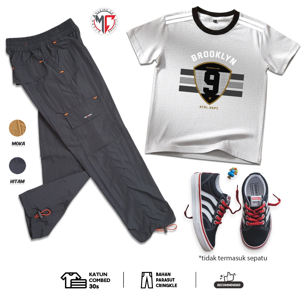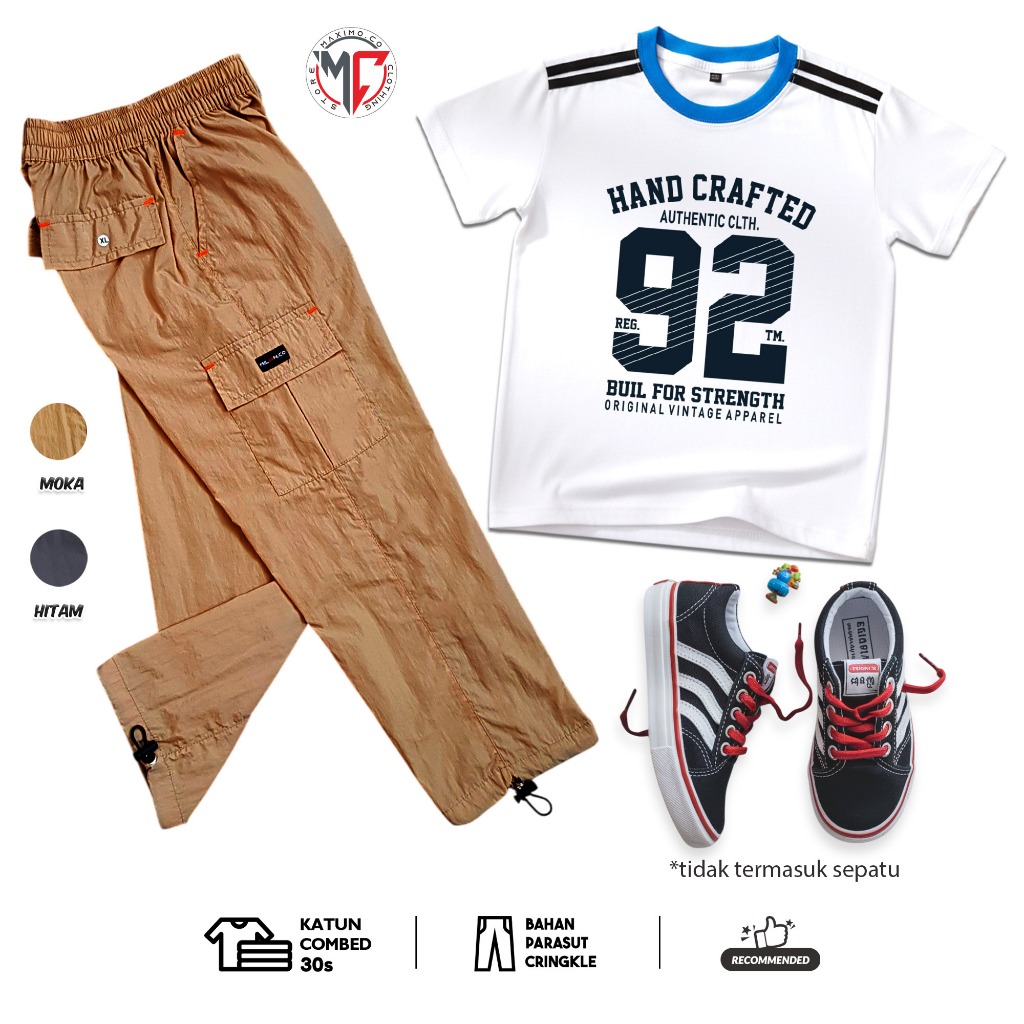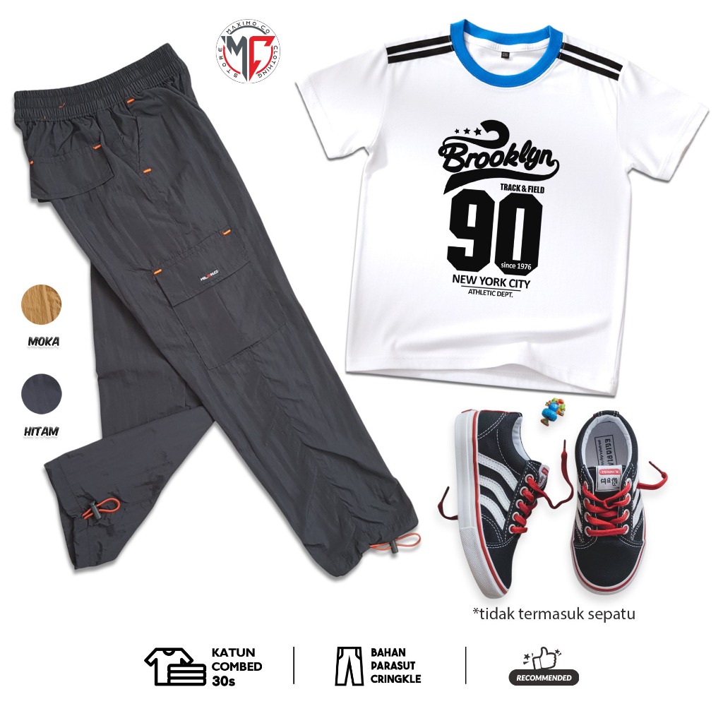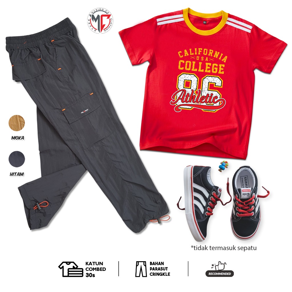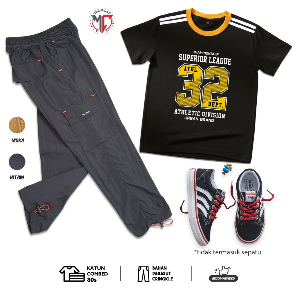 MAXIMO.CO Setelan Baju Anak Sporty Baseball Angka dan Celana Kargo Cringkle Panjang Usia 3-12 Tahun