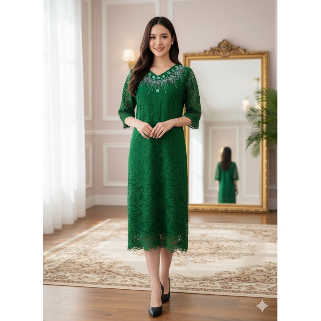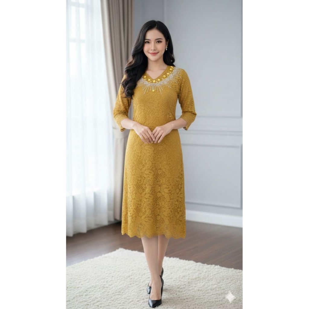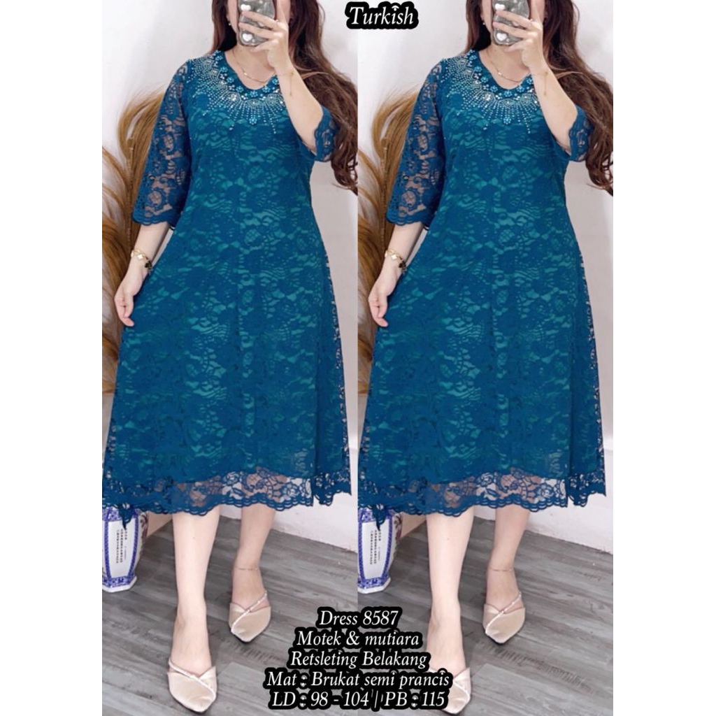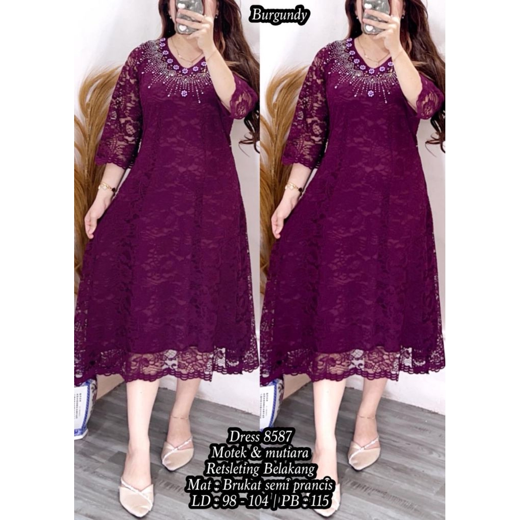 Dress 8587 Motek & mutiara Retsleting Belakang Mat : Brukat semi prancis