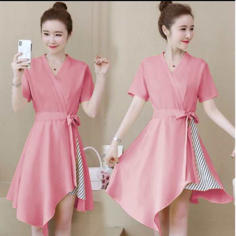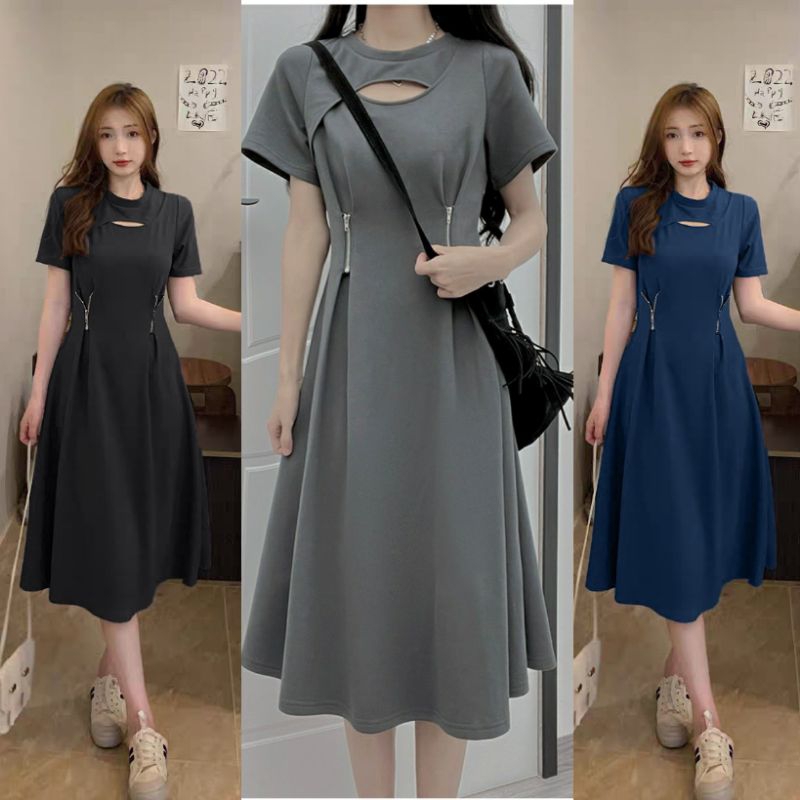 dress dola ziper kaos tebal hn/pakaian wanita midi dress polos selutut