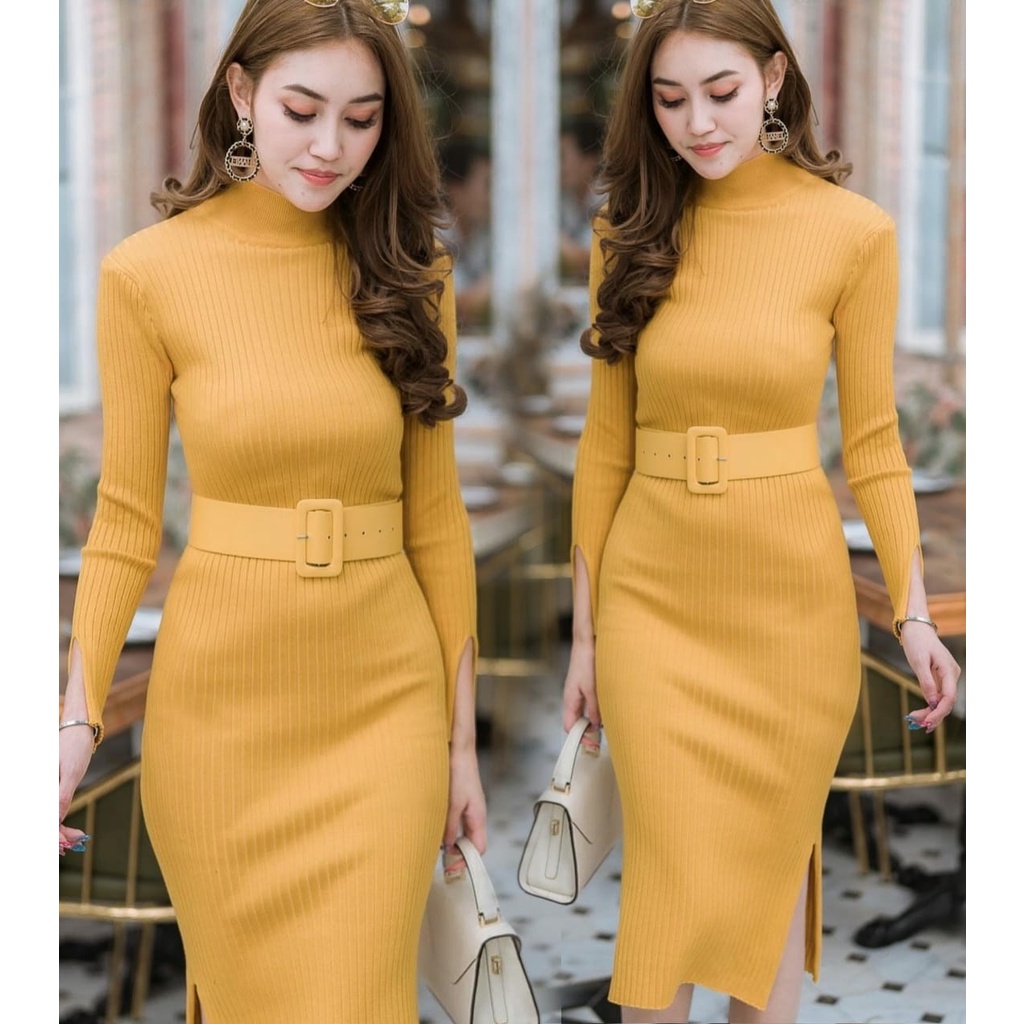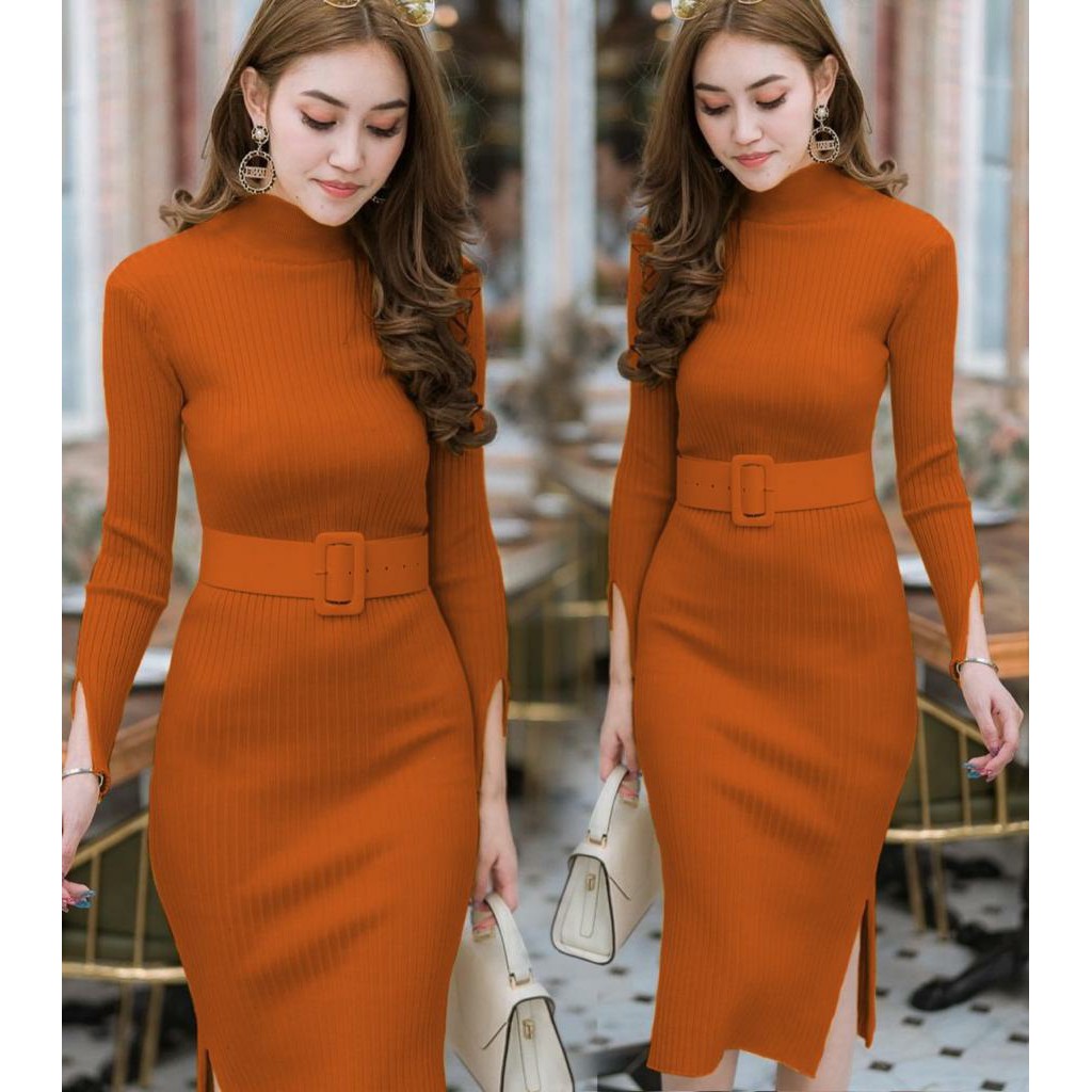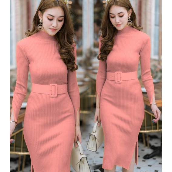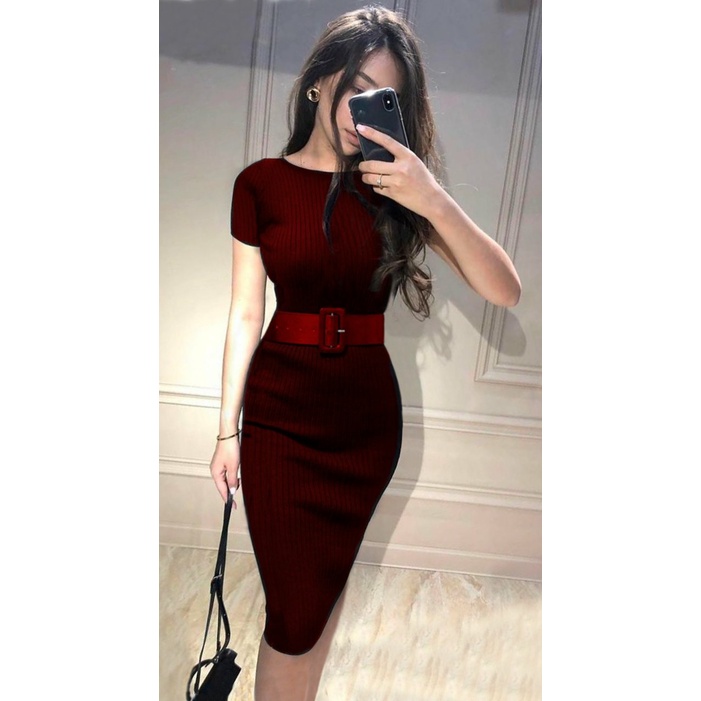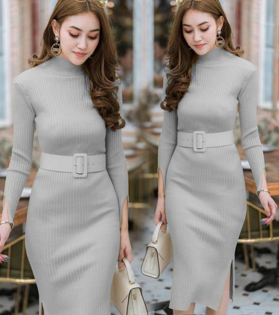 COD✔Dress wanita rajut LP free belt fbb / pakaian wanita dress panjang bodycon / dress nicole rajut