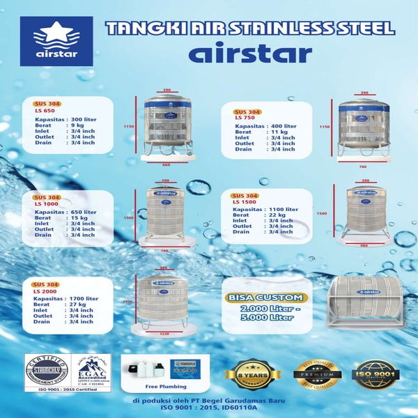 tandon tangki toren air atas rumah stainless stenlis steel vertikal merek airstar rstar r star Ls 1500 volume 1100 1000 liter untuk air pdam kualitas tirta termurah anti karat di surabaya sidoarjo gresik jawa timur