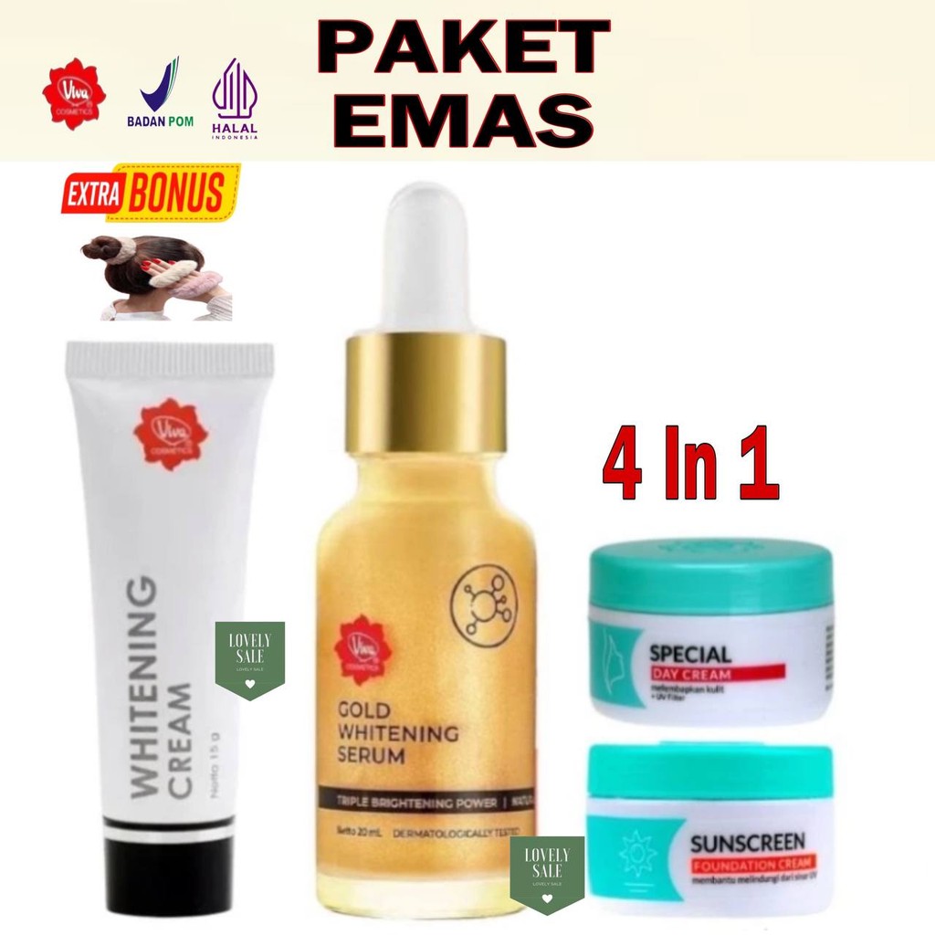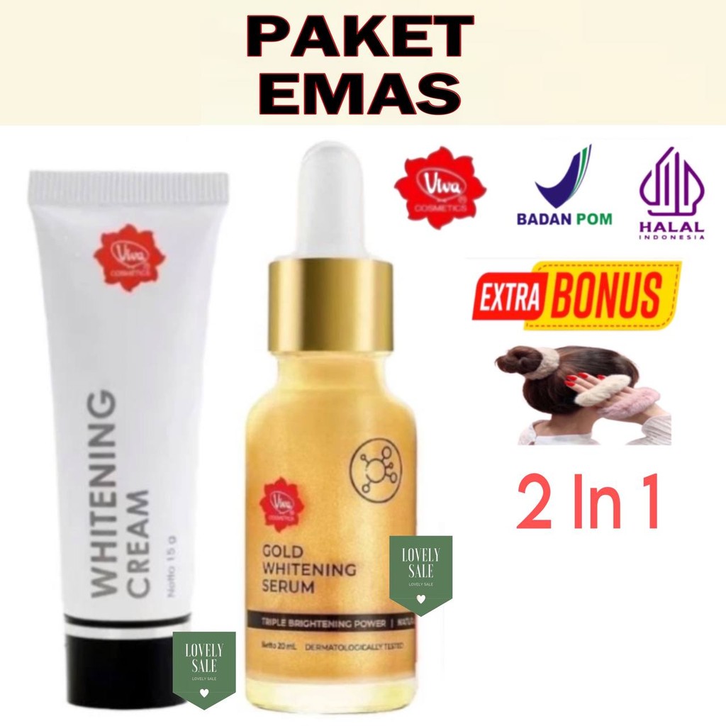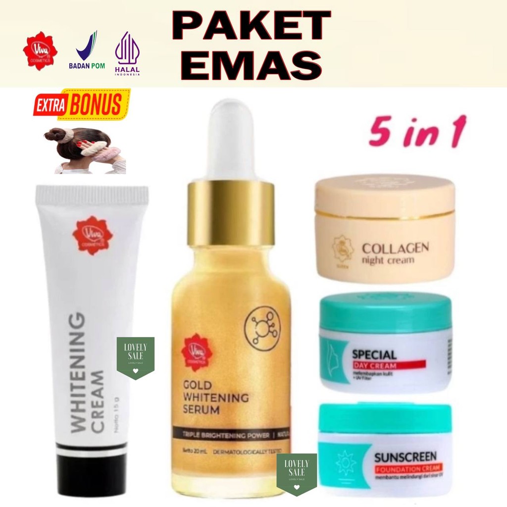 Paket Gold Whitening Skincare 5in1 VIVA Anti Flek Hitam Day Sunscreen Whitening Night Glowing Serum Gratis Ikat Rambut Halal Original BPOM