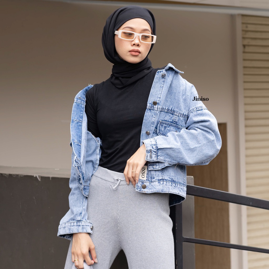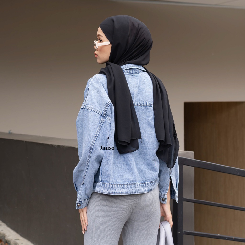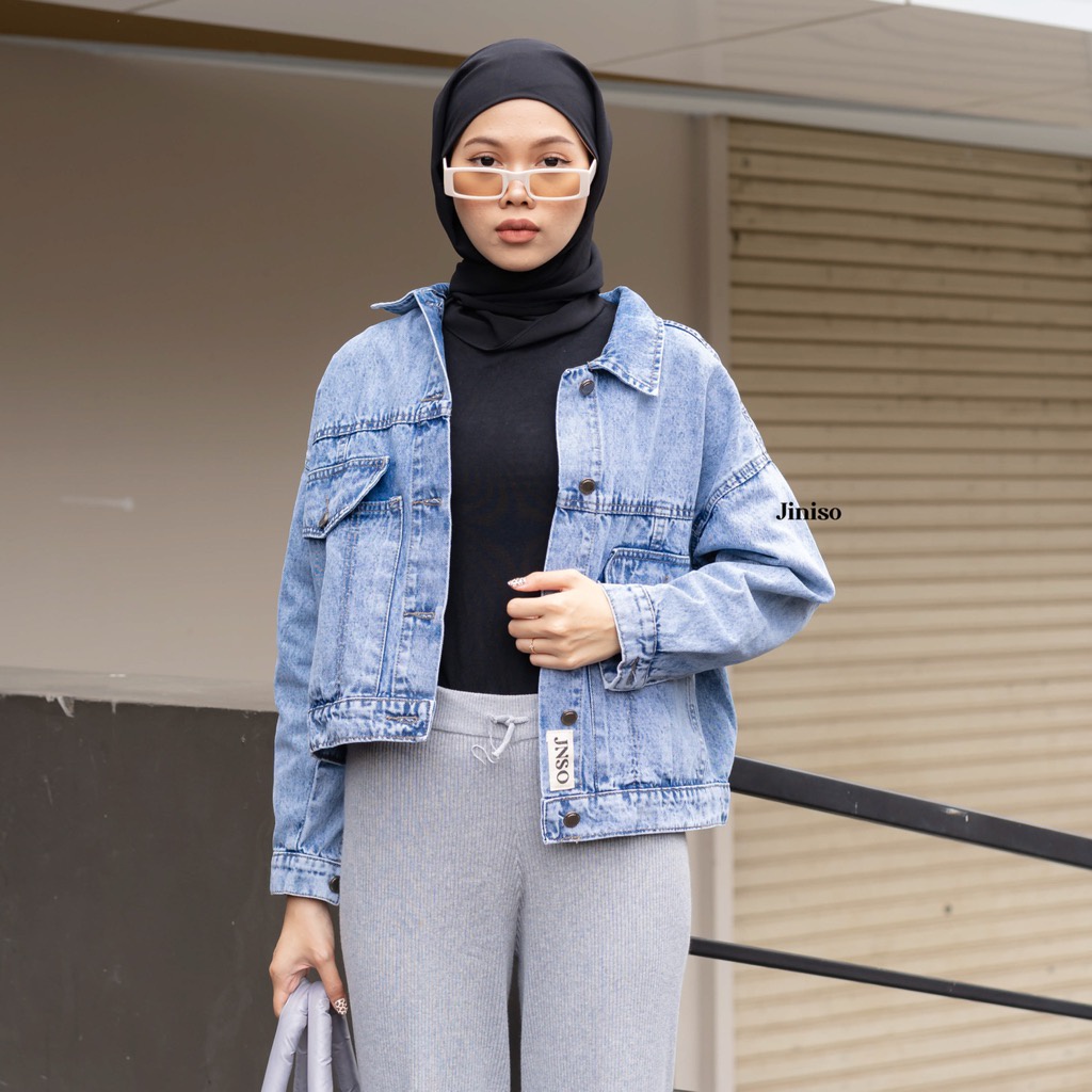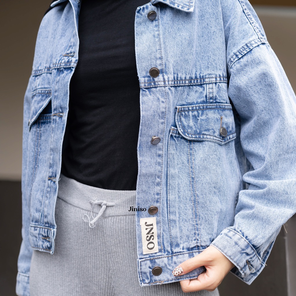 JINISO Jaket Crop Jeans Oversize Vintage Pocket Blue Acid