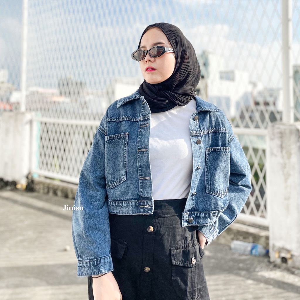 JINISO Jaket Crop Jeans Oversize Pocket Blue Acid