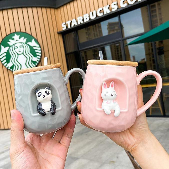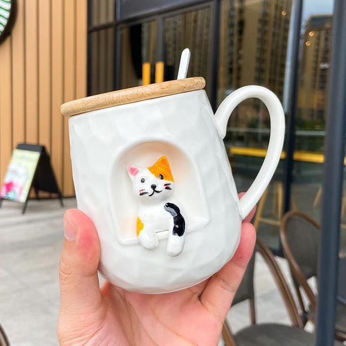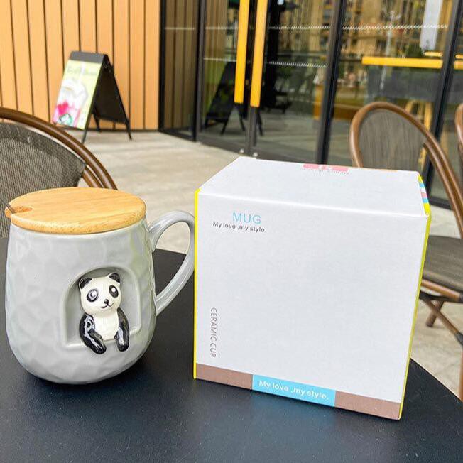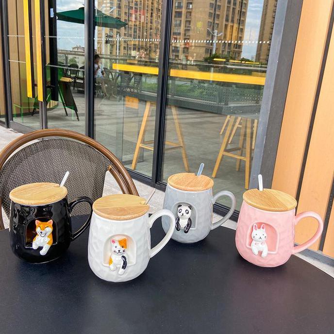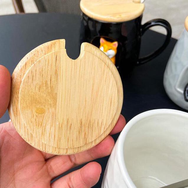 Mug Cangkir Set Dengan Tutup Kayu + Sendok Bahan Keramik / Gelas Kopi - Motif 2