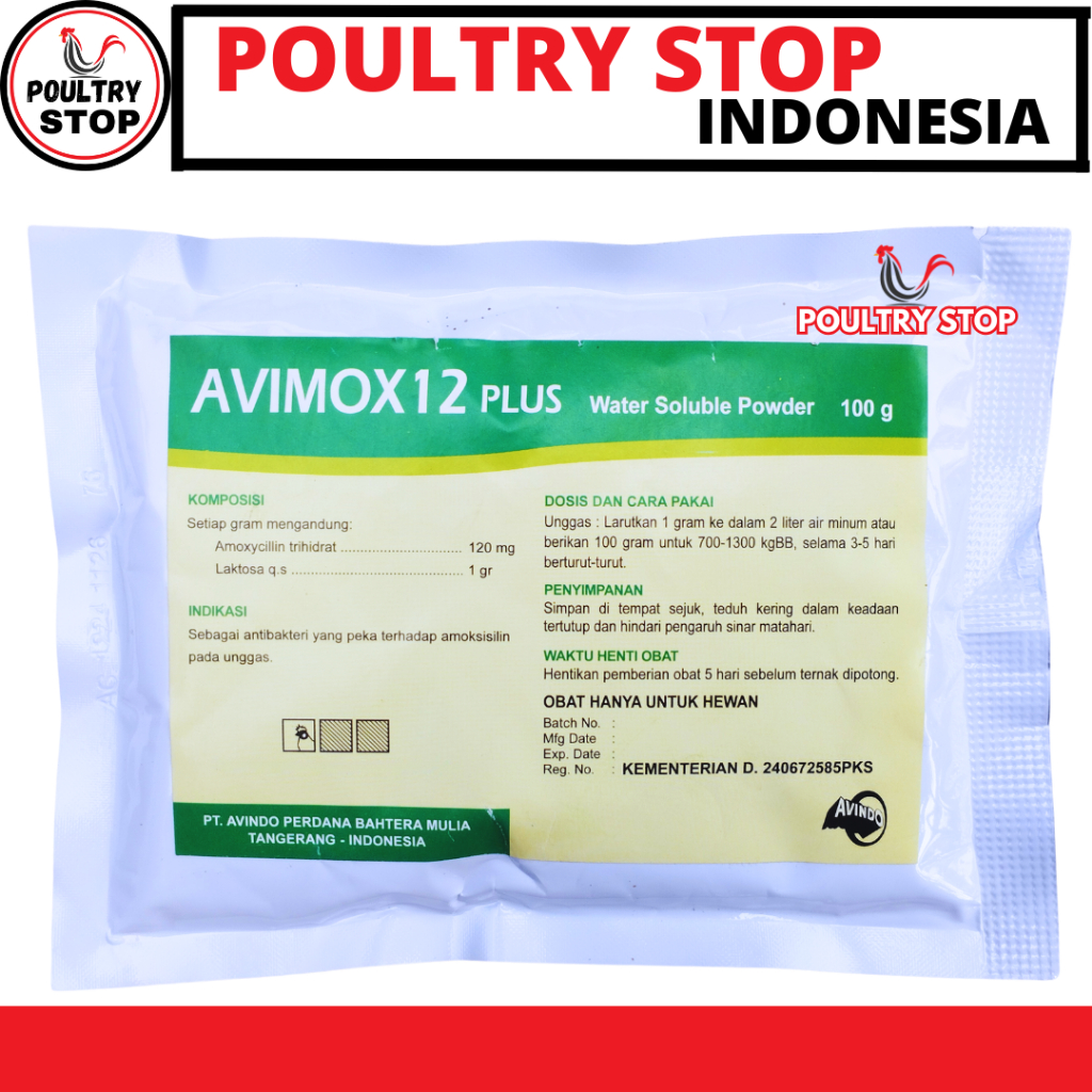 AVIMOX 12 PLUS 100 GRAM - Obat Ayam Snot Koli Berak Kapur Berak Hijau Pencernaan Ayam Unggas AVINDO