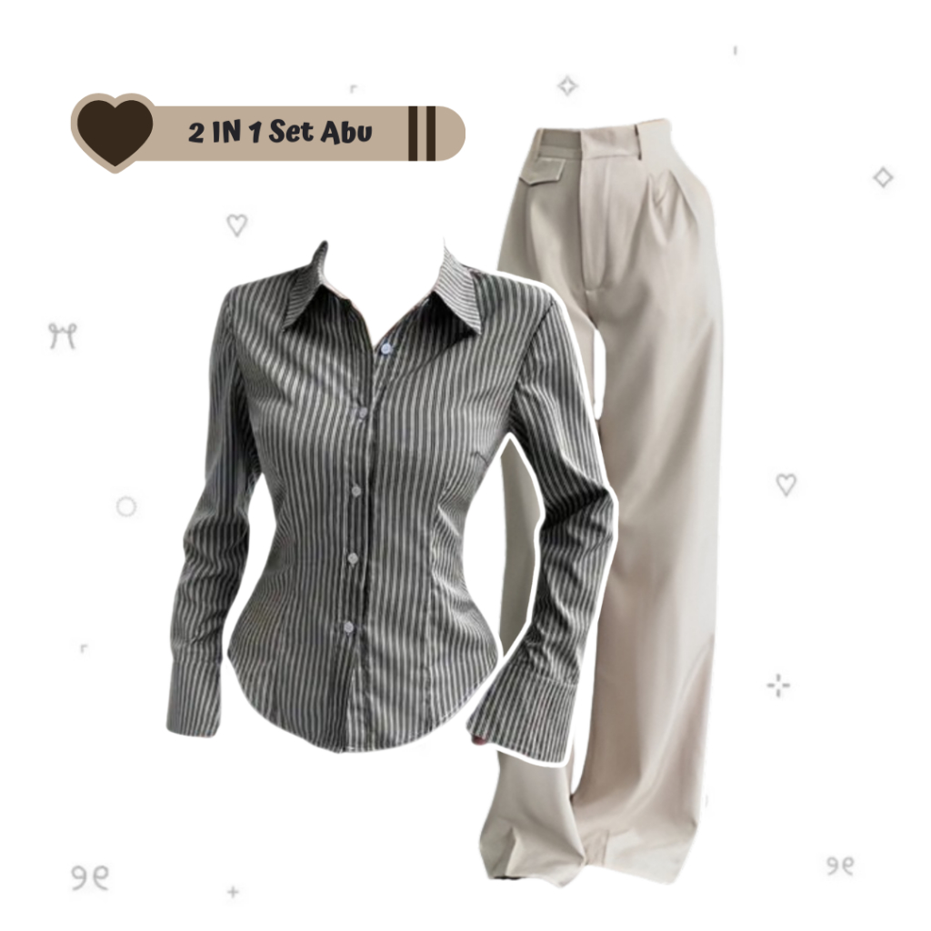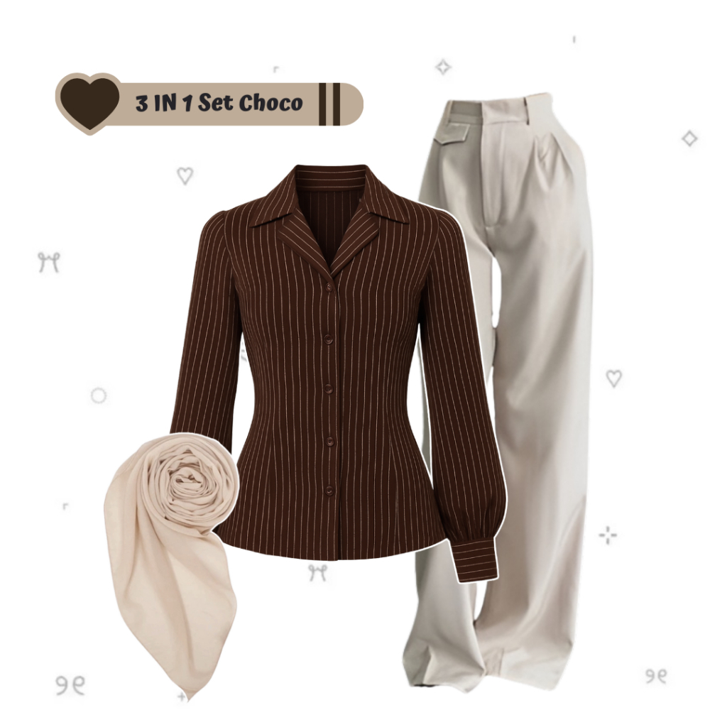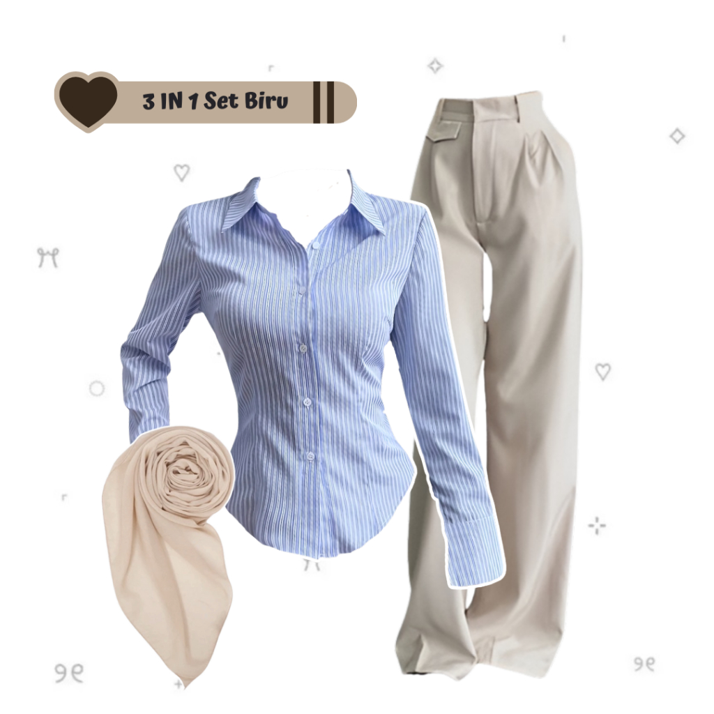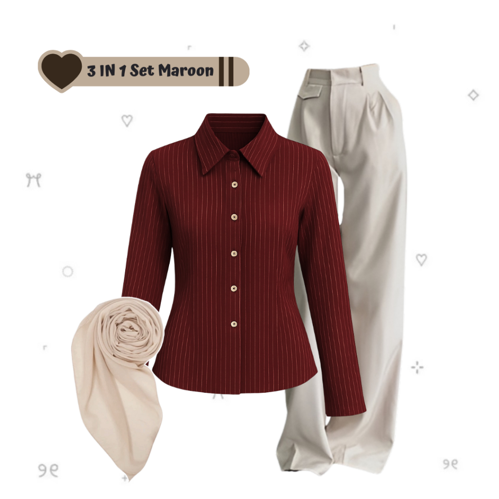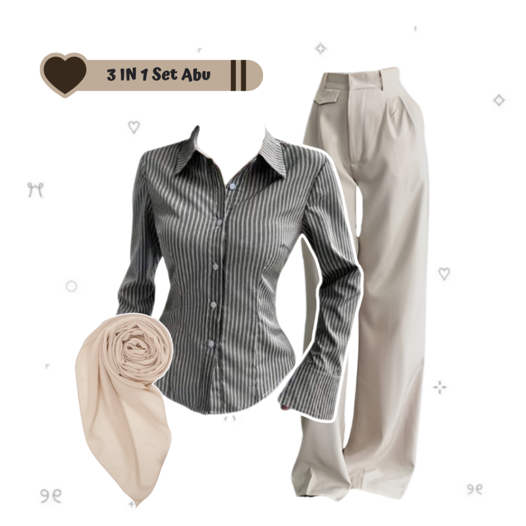 sharenaoutfit - 3 IN 1 One Set Hijab Korean Outfit Style Remaja Kekinian Outfit Kemeja Wispie Salur Outfit Terbaru (Kemeja Salur Wispie + Celana Oro + Hijab Pashmina) - SET AE285