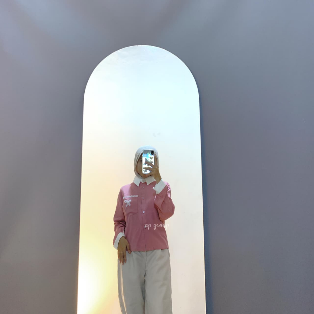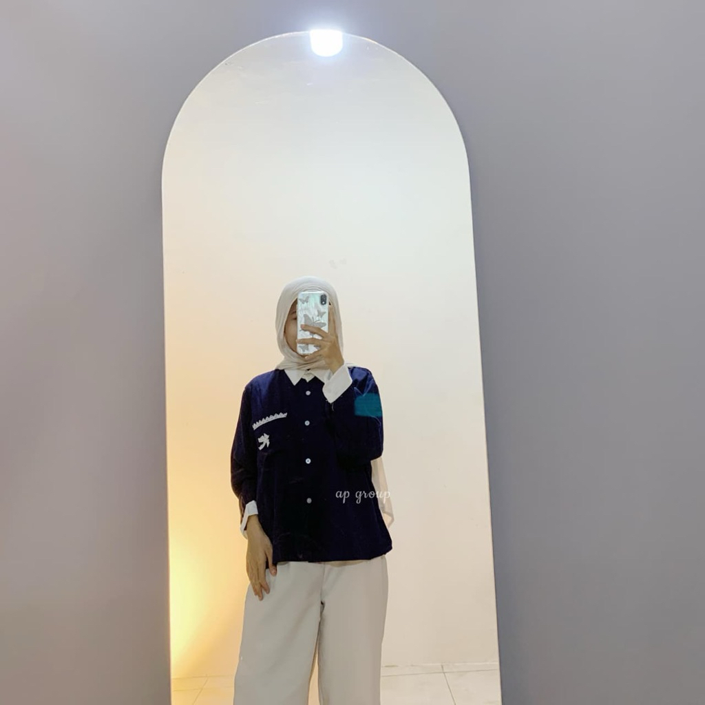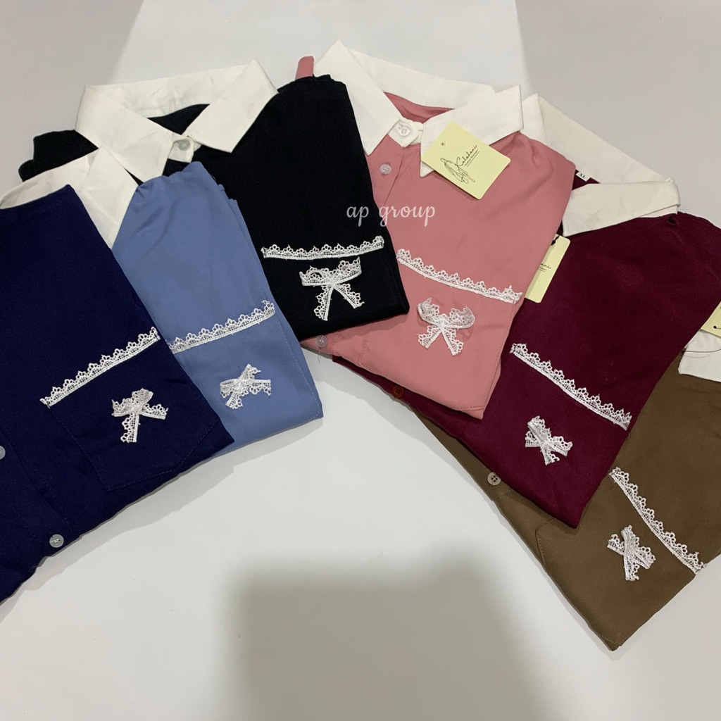 Kemeja Wanita Blouse Polos Lengan Panjang Kerah Kontras Aksen Pita Premium Import