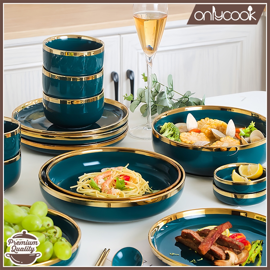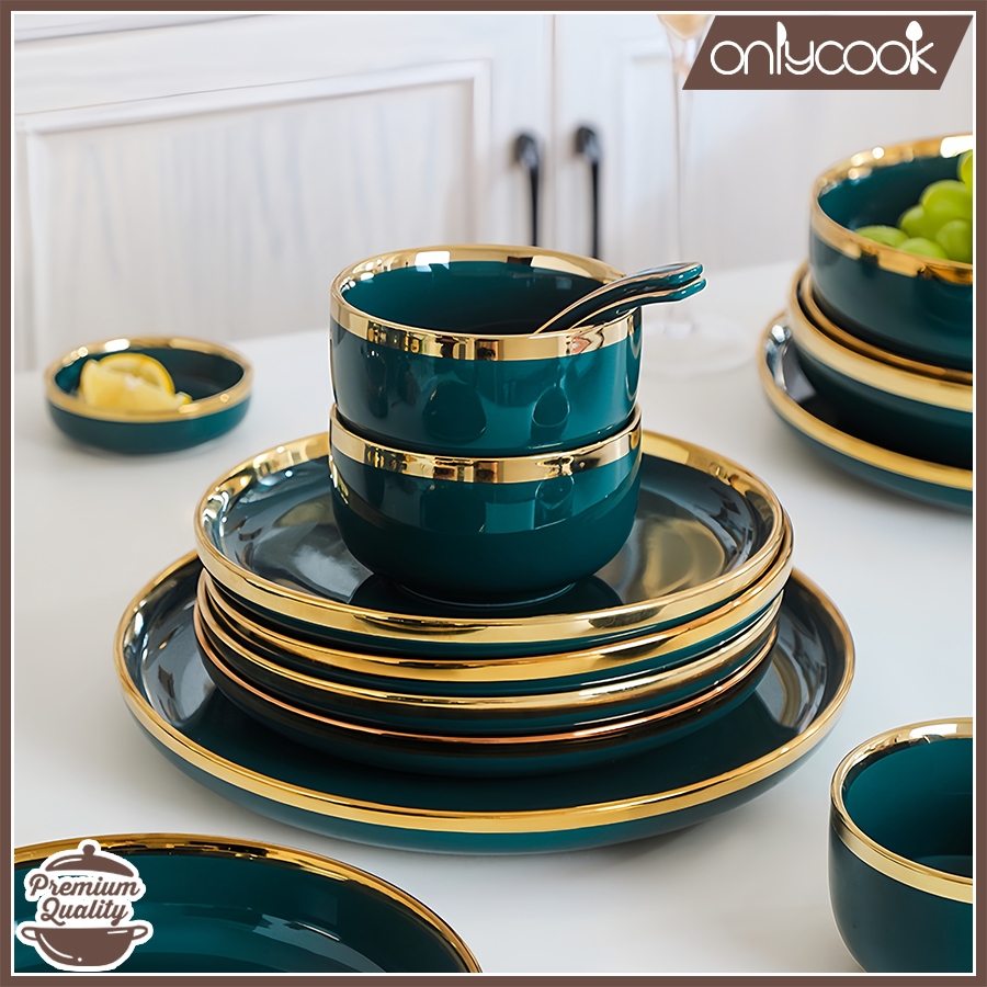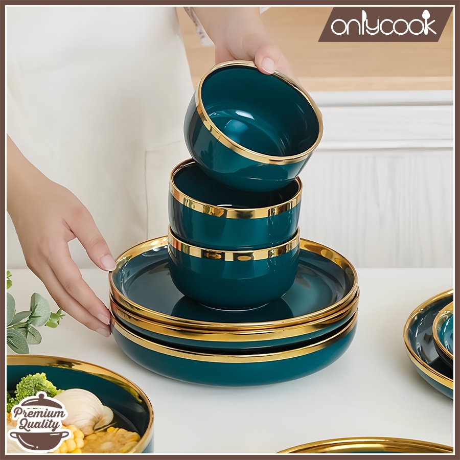 ONLYCOOK Piring Makan Keramik Hijau Gold/Mangkuk Keramik Hijau Emerald Gold Elegan