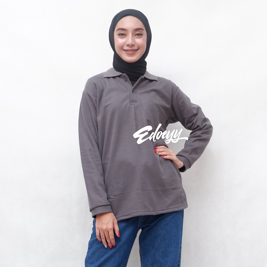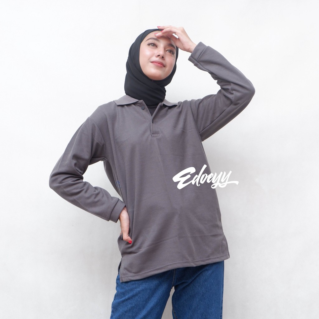 Kaos Polo Shirt Wanita Lengan Panjang ABU TUA - Baju Kerah Berkerah Cewek Lengan Panjang