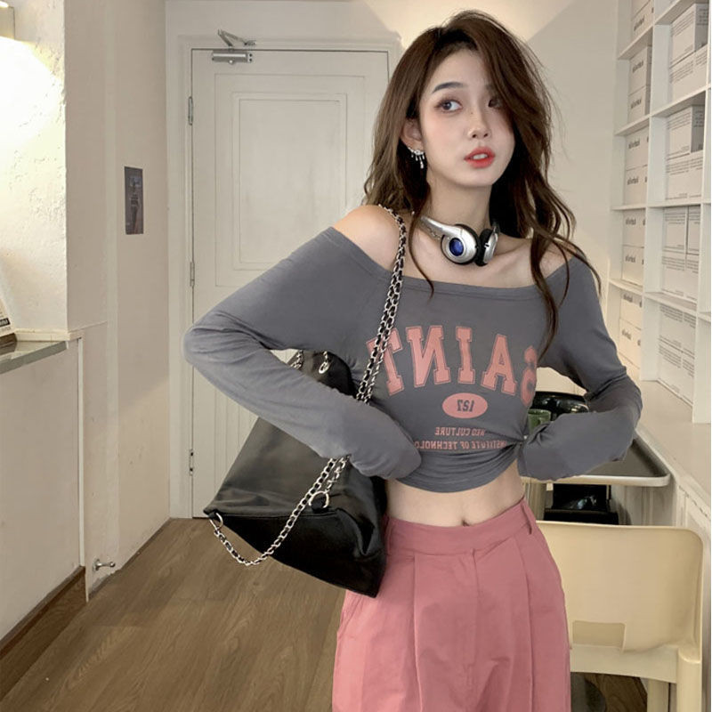 [Cream Winnie]Setelan Amerika Perempuan Populer Atasan Lengan Panjang Satu Bahu Pendek Celana Panjang Legging Overall Wanita Set Dua Potong Musim Semi Dan Musim Panas