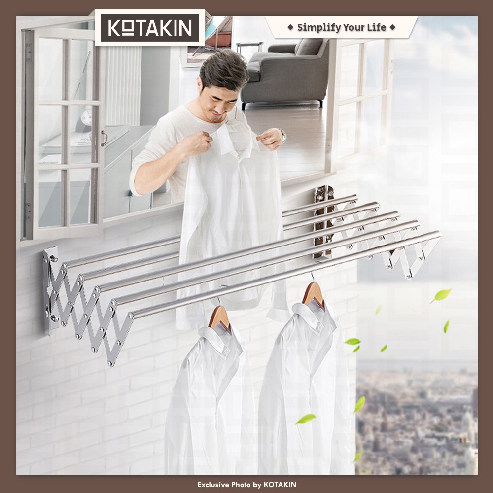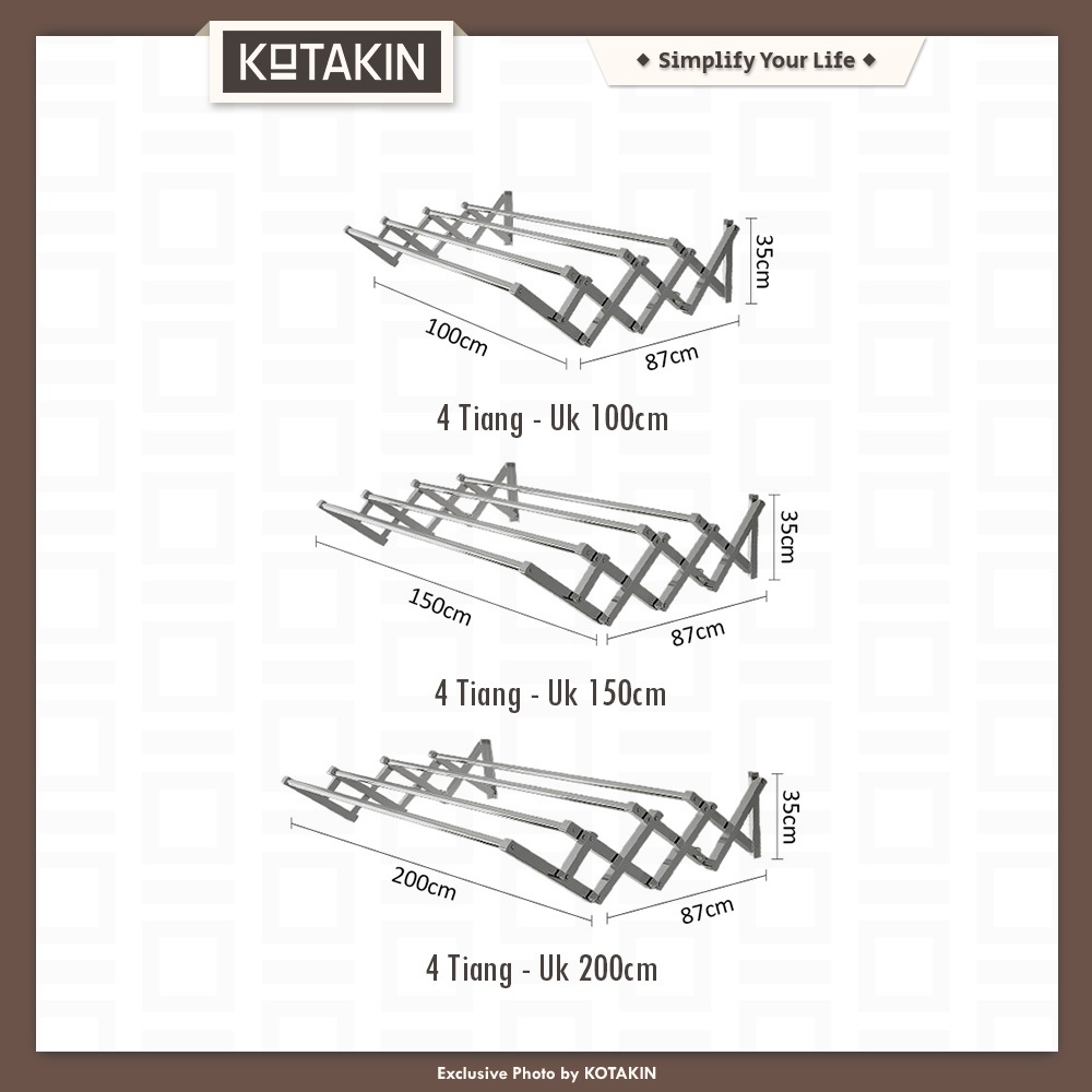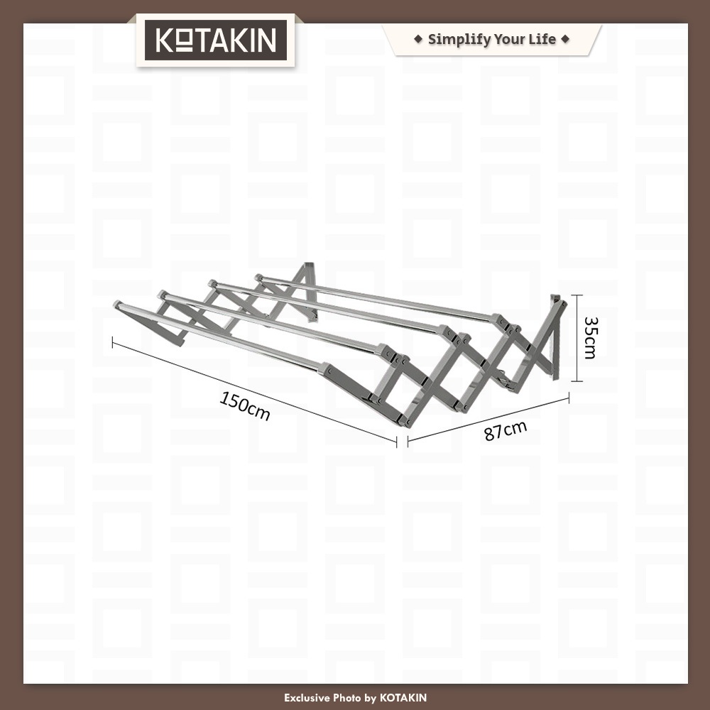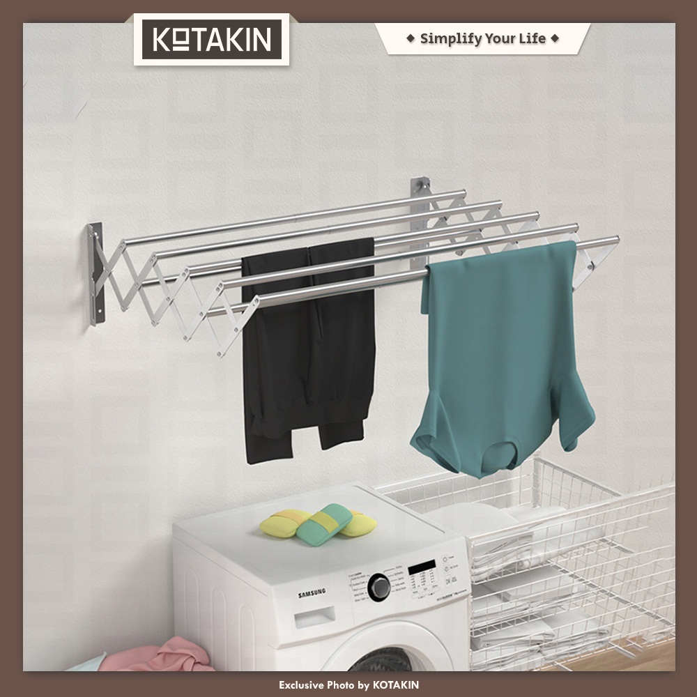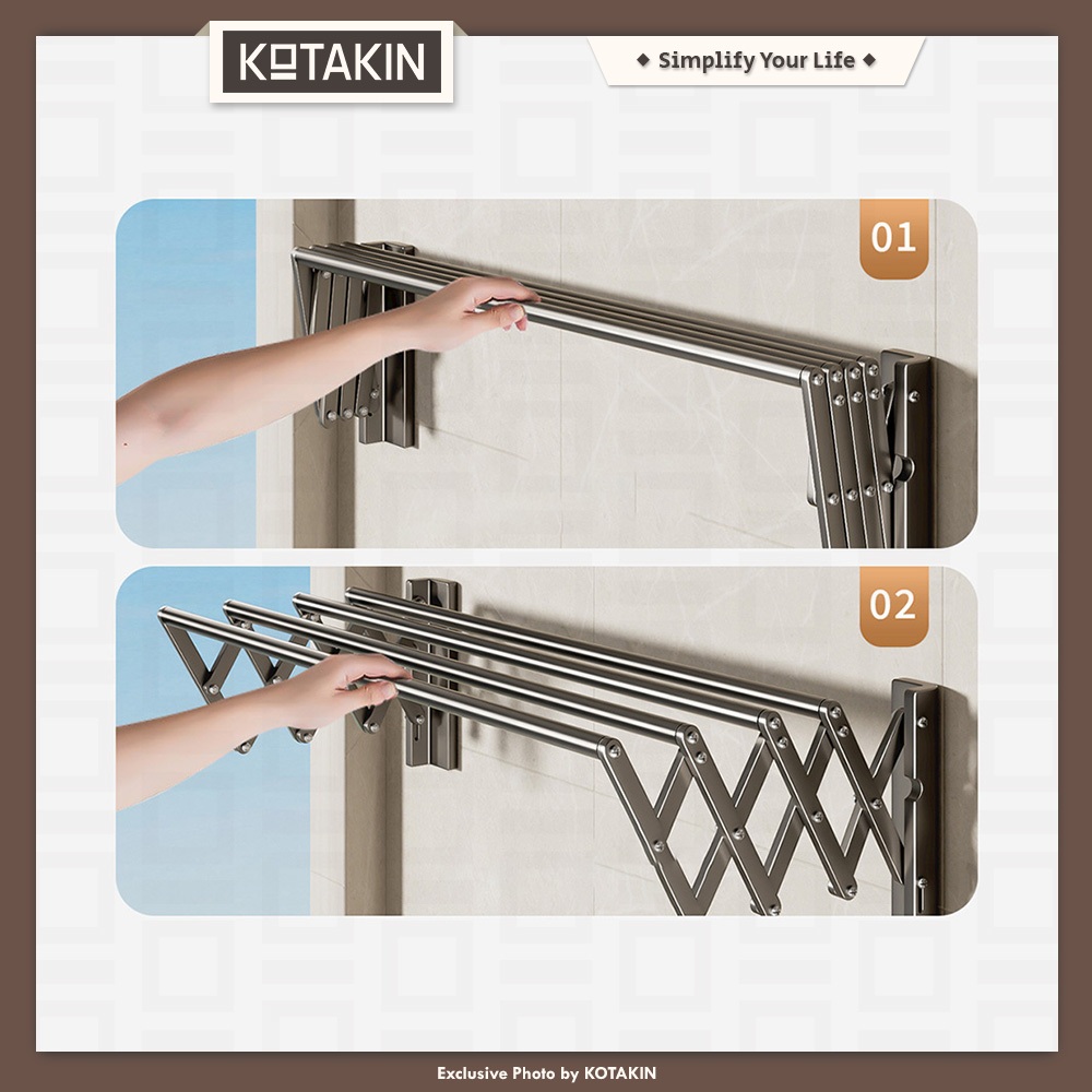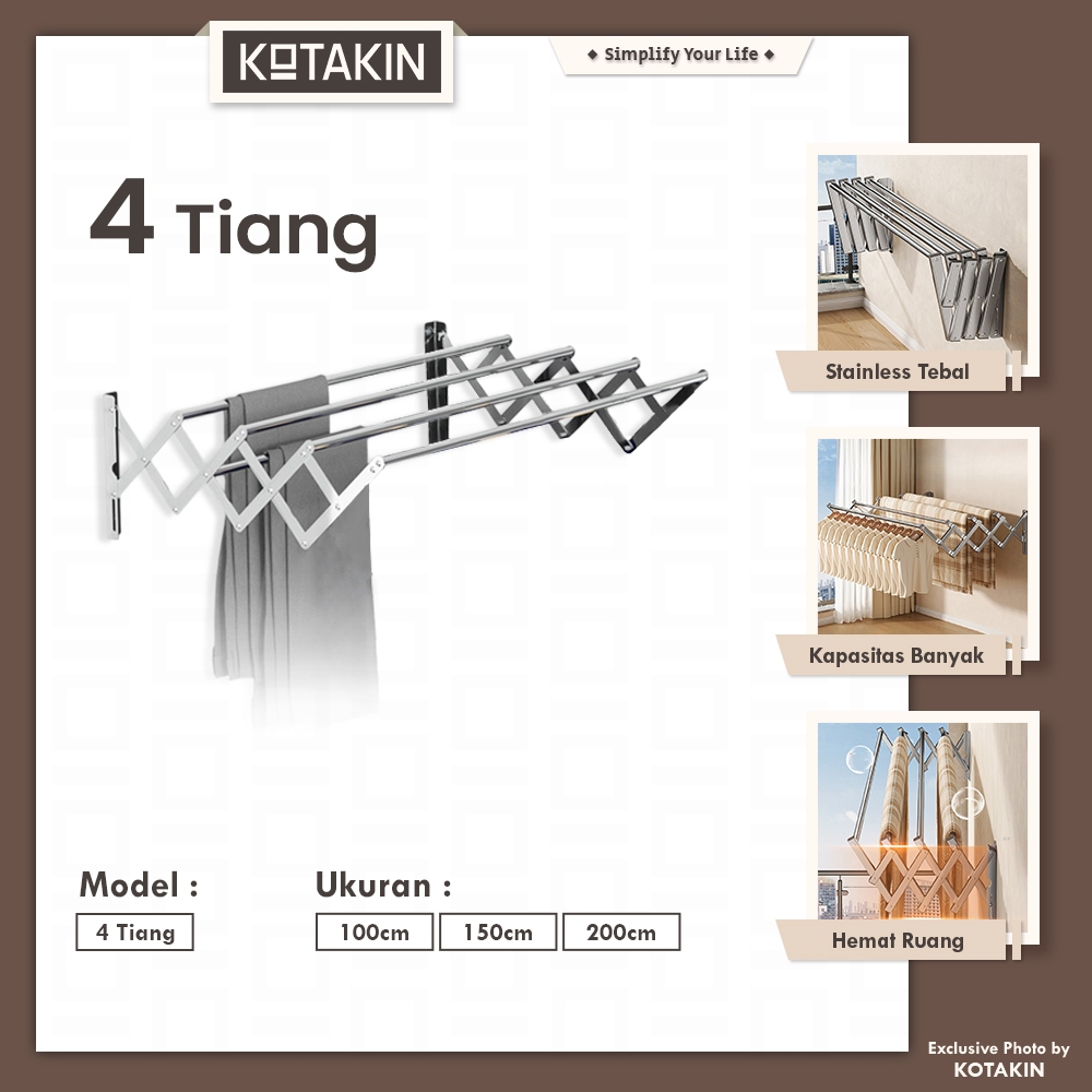KOTAKIN Jemuran Gantung 4 Pipa 100 150 200cm Stainless Steel Lipat Tarik Dinding Tembok