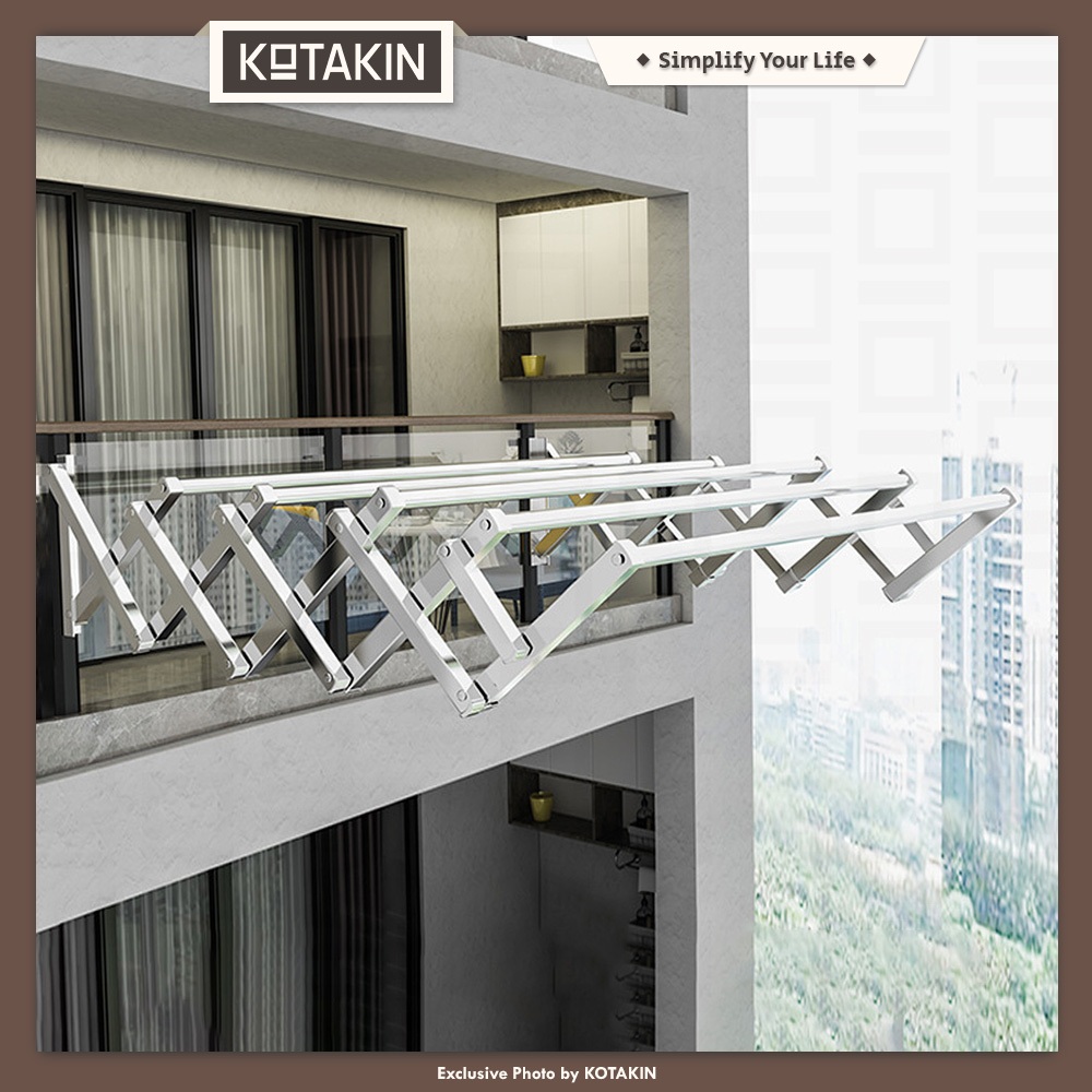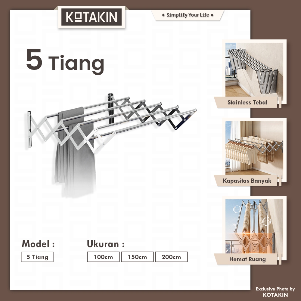 KOTAKIN Jemuran Baju Handuk Tarik Dinding Lipat 5 Pipa 100 150 200cm Stainless Steel Kokoh