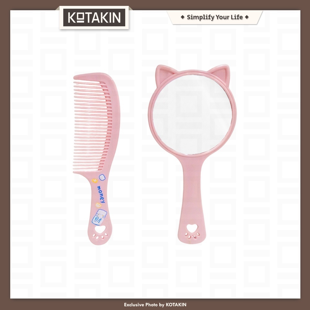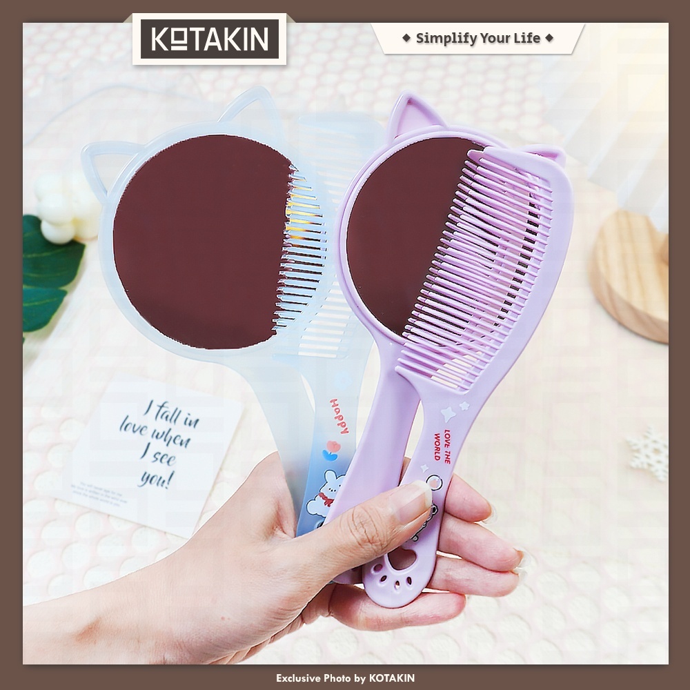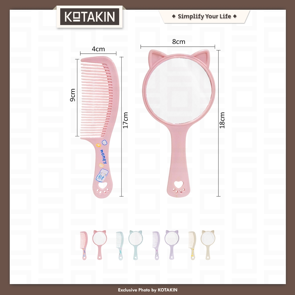 KOTAKIN Set Kaca Sisir Cermin Kucing Lucu Travel Portabel Comb Hair Make Up Bulat Gagang