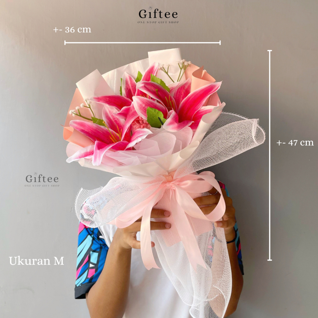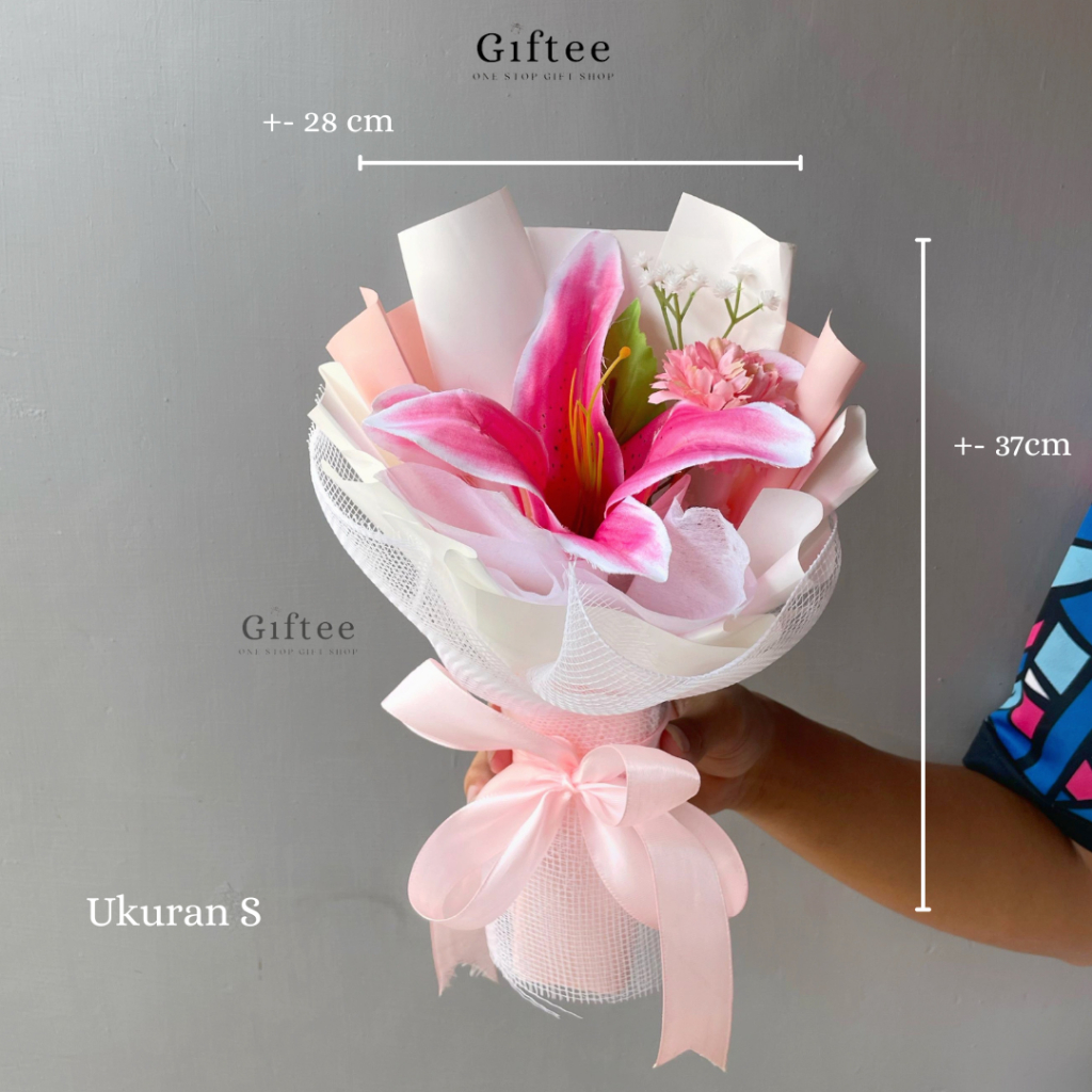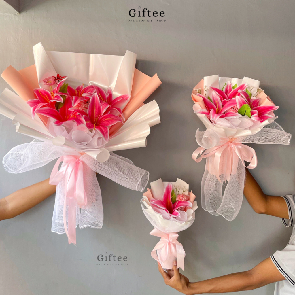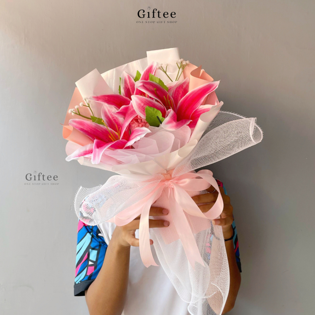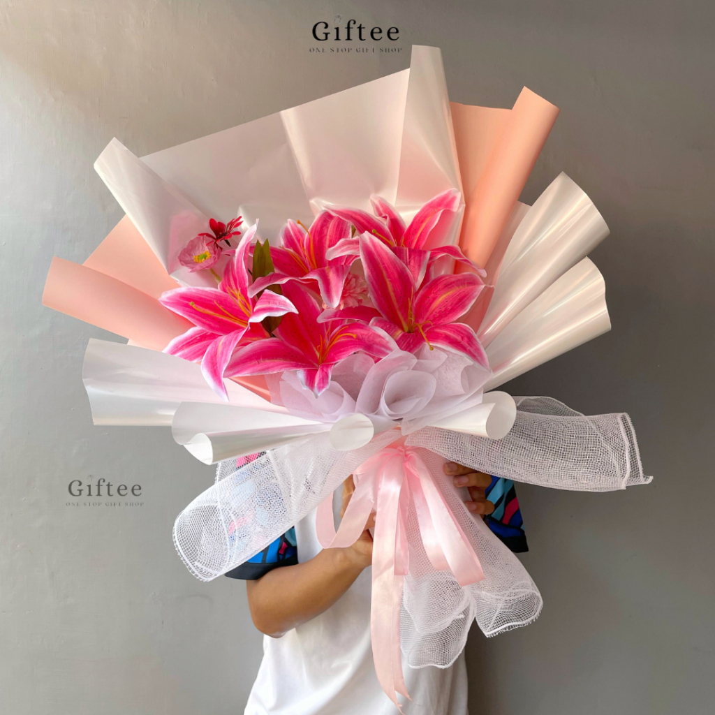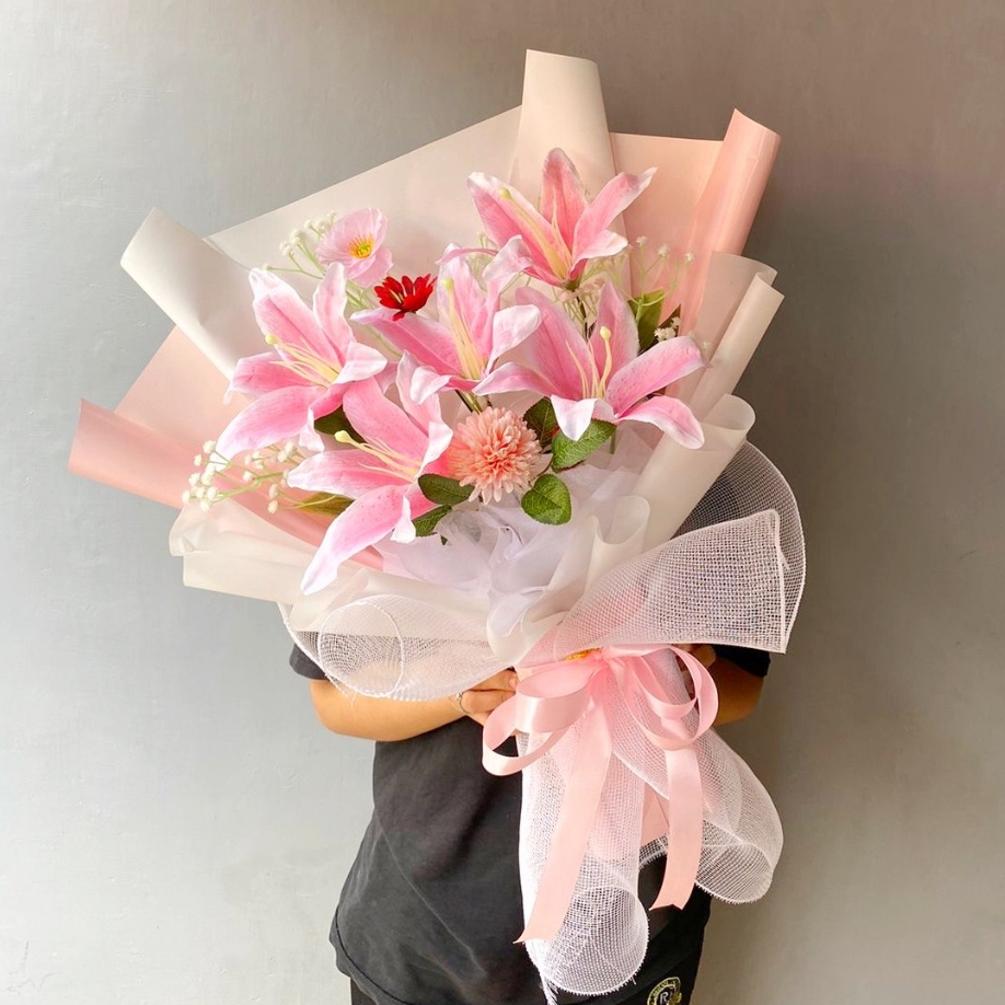 BUKET BUNGA VALILY BUNGA LILY LILI WHITE PINK ARTIFICIAL PALSU KADO ULANG TAHUN WISUDA ANNIVERSARY