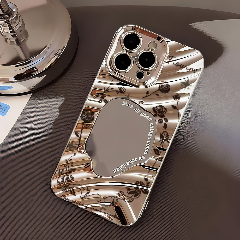Pola mawar hitam Casing Hp Untuk iPhone 16 11 13 15 14 12 Pro Max X XR XS Max 8 7 6 Plus SE Case Cermin Bermotif Gelombang Perak Mewah Dan Indah Cangkang Pelindung Anti Guncangan Kesing