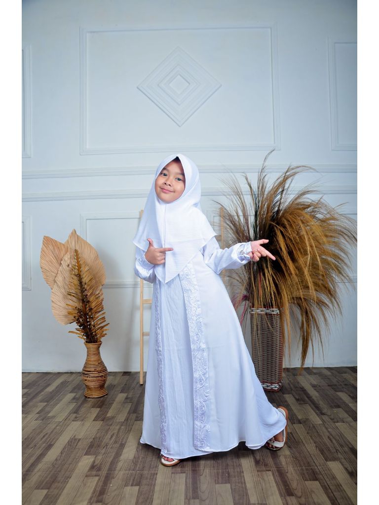 Shmofficial - Gamis Bordir Abaya Putih Set Hijab Syari Polos Premium Outfit Umroh Haji Ceruty Bordir