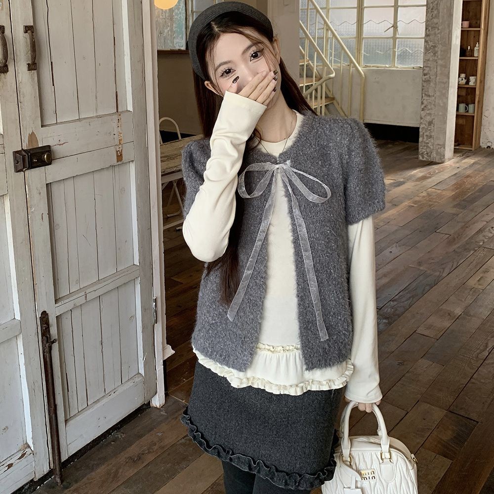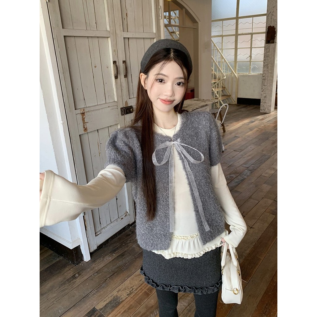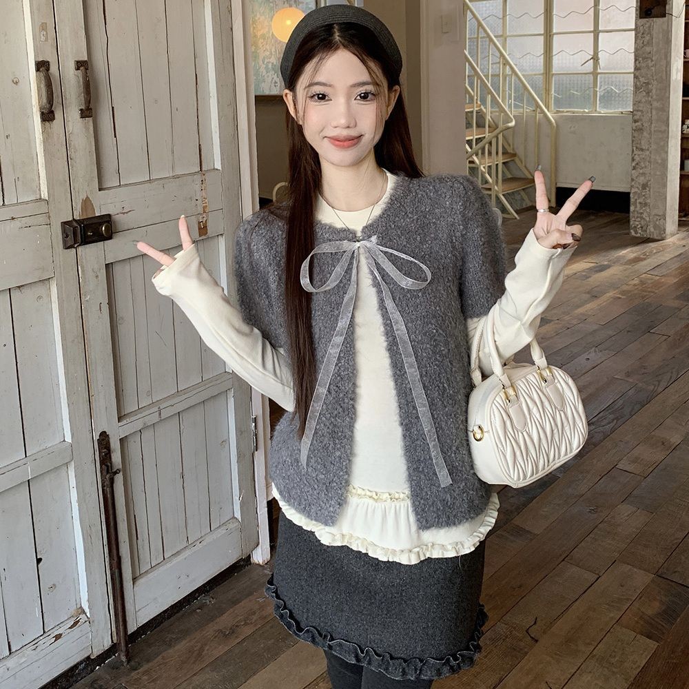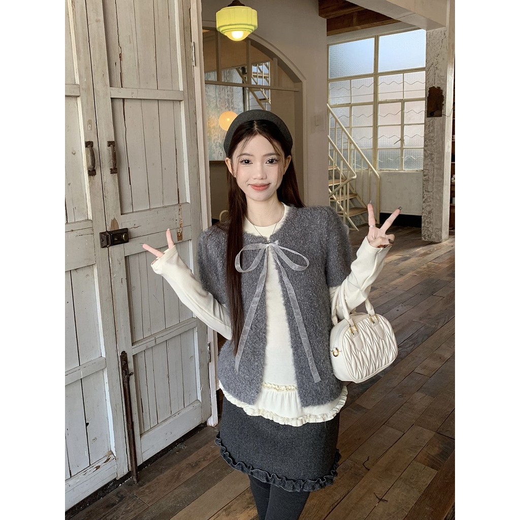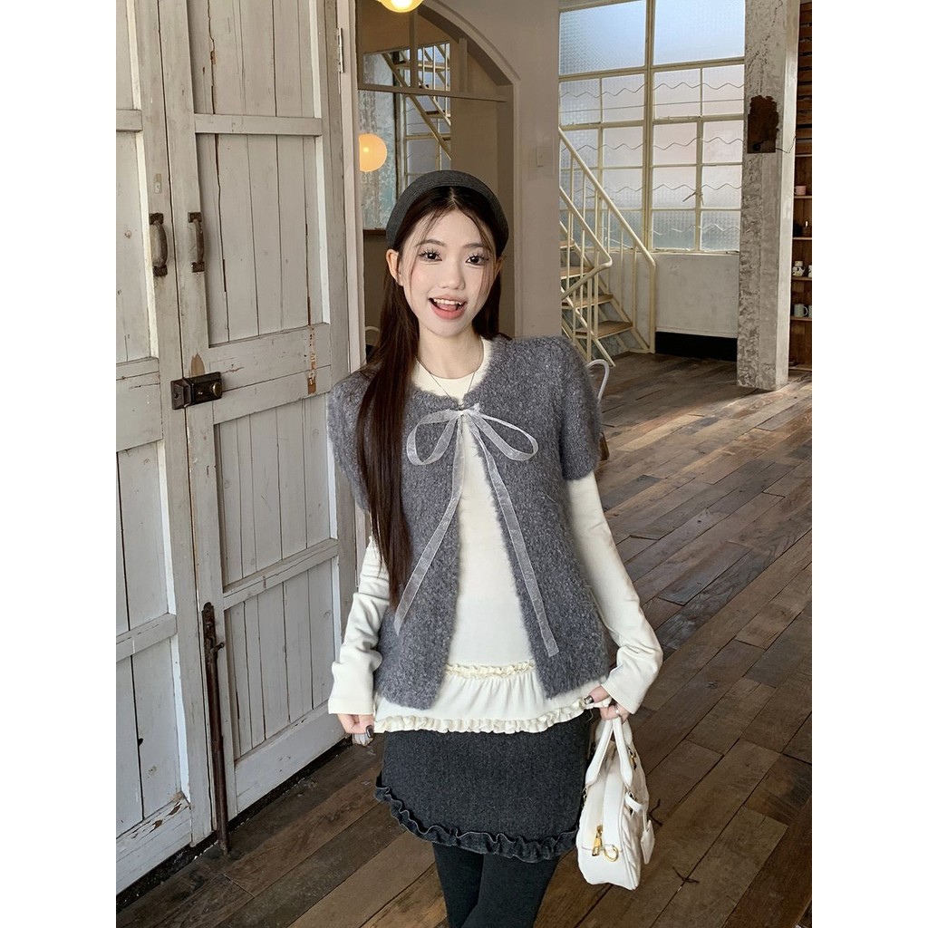 Crunchy brulee Pakaian mode wanita kardigan rajutan pita vagina dengan kaos dan rok, setelan tiga potong