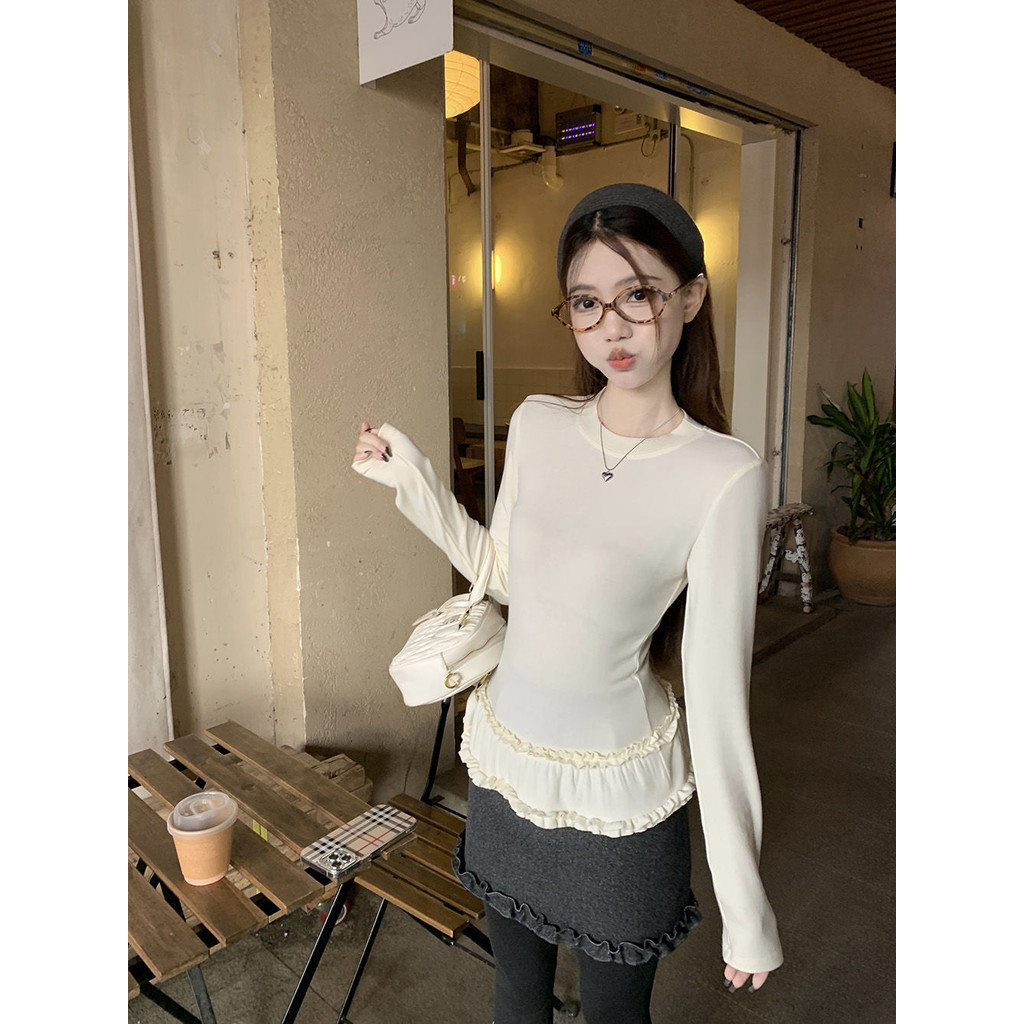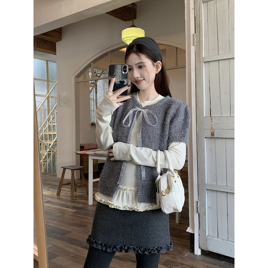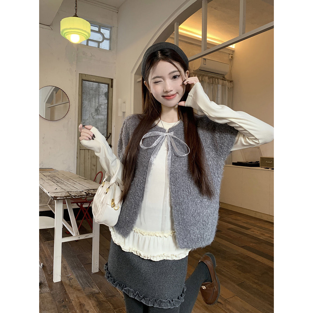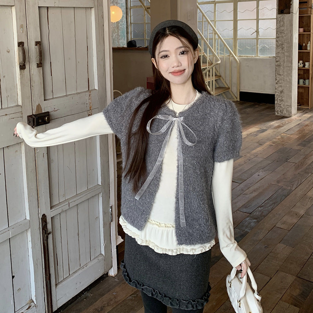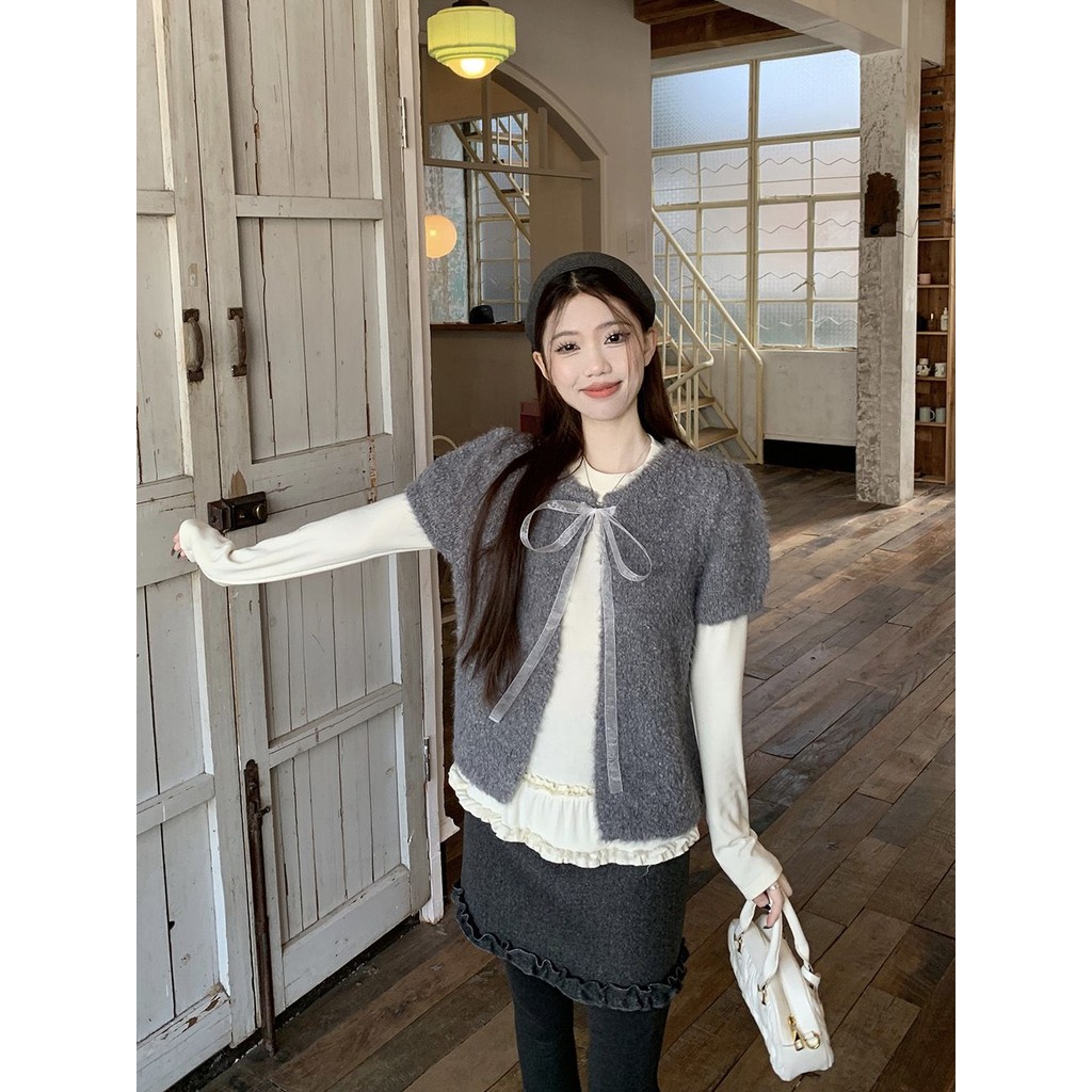 Crunchy brulee Pakaian mode wanita kardigan rajutan pita vagina dengan kaos dan rok, setelan tiga potong