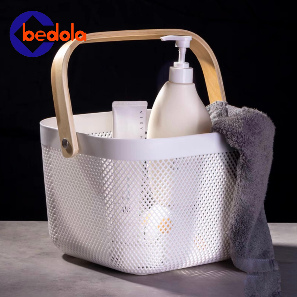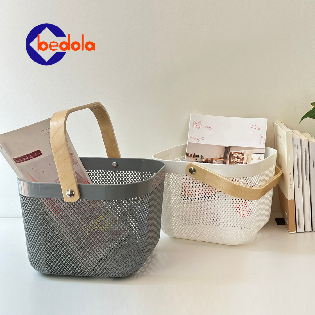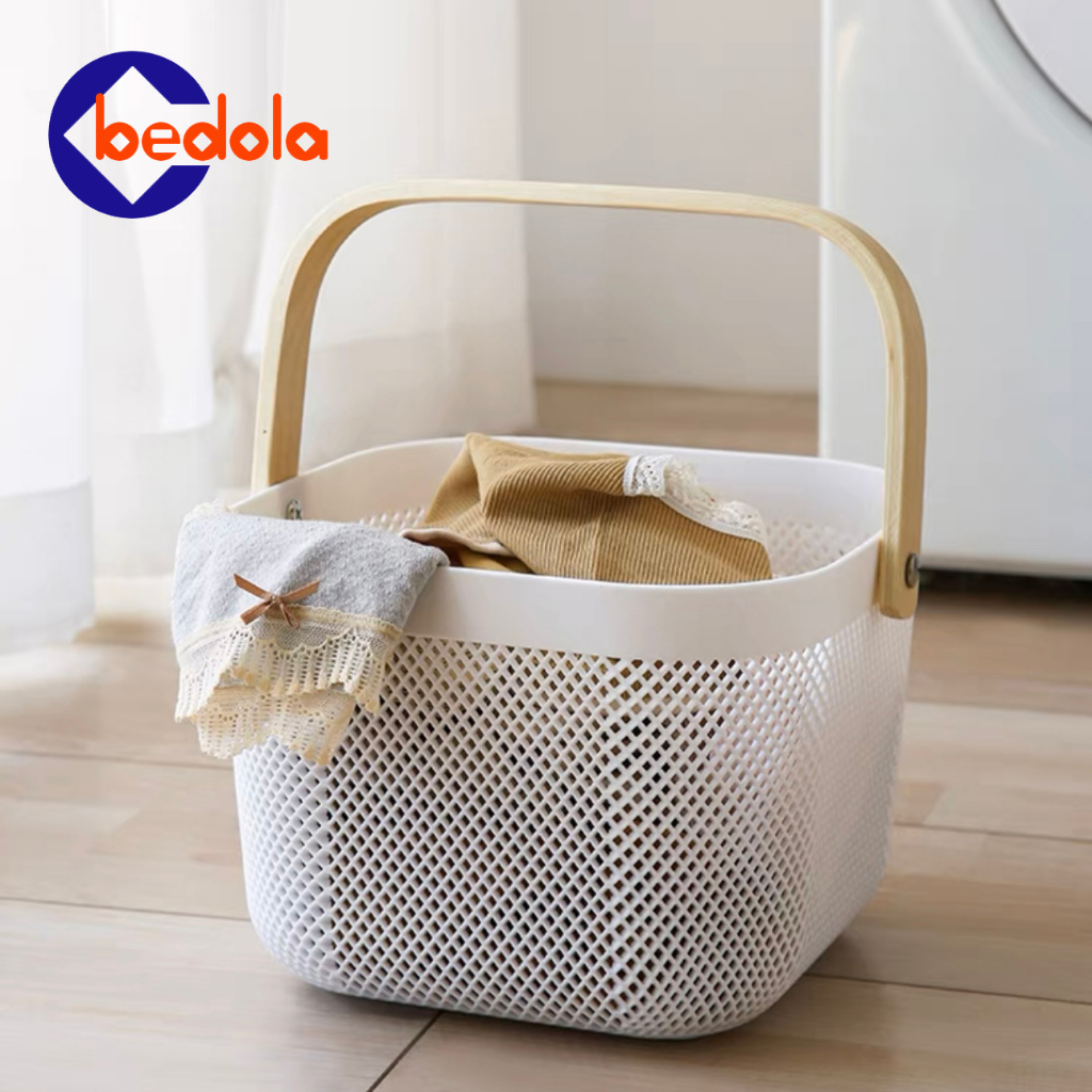 Keranjang plastik keranjang penyimpanan basket serbaguna handle kayu